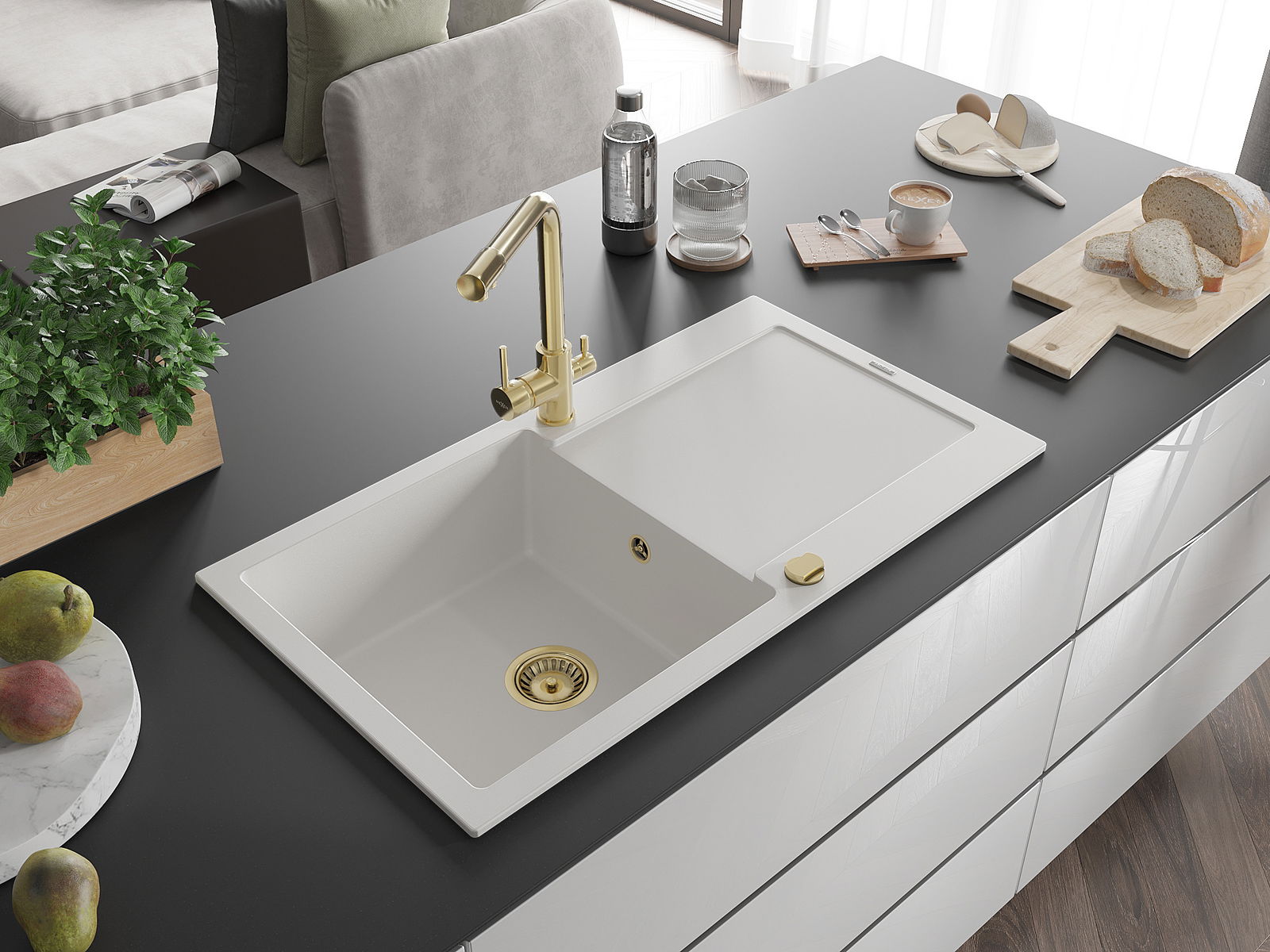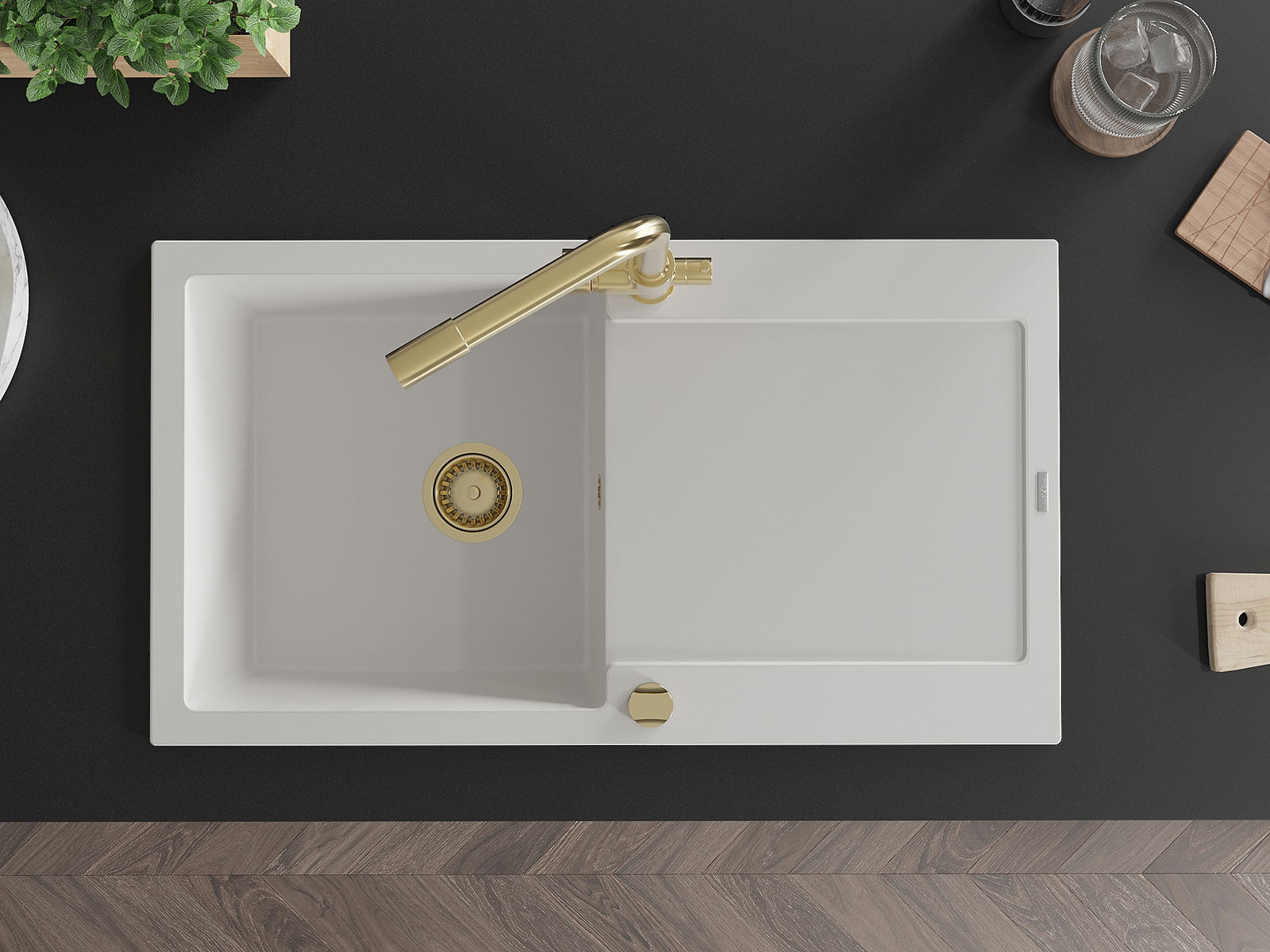 Mexen Leo gránit mosogató egykamrás, csepegtetővel és Duero konyhai csappal, fehér - 6501-20-671600-50
