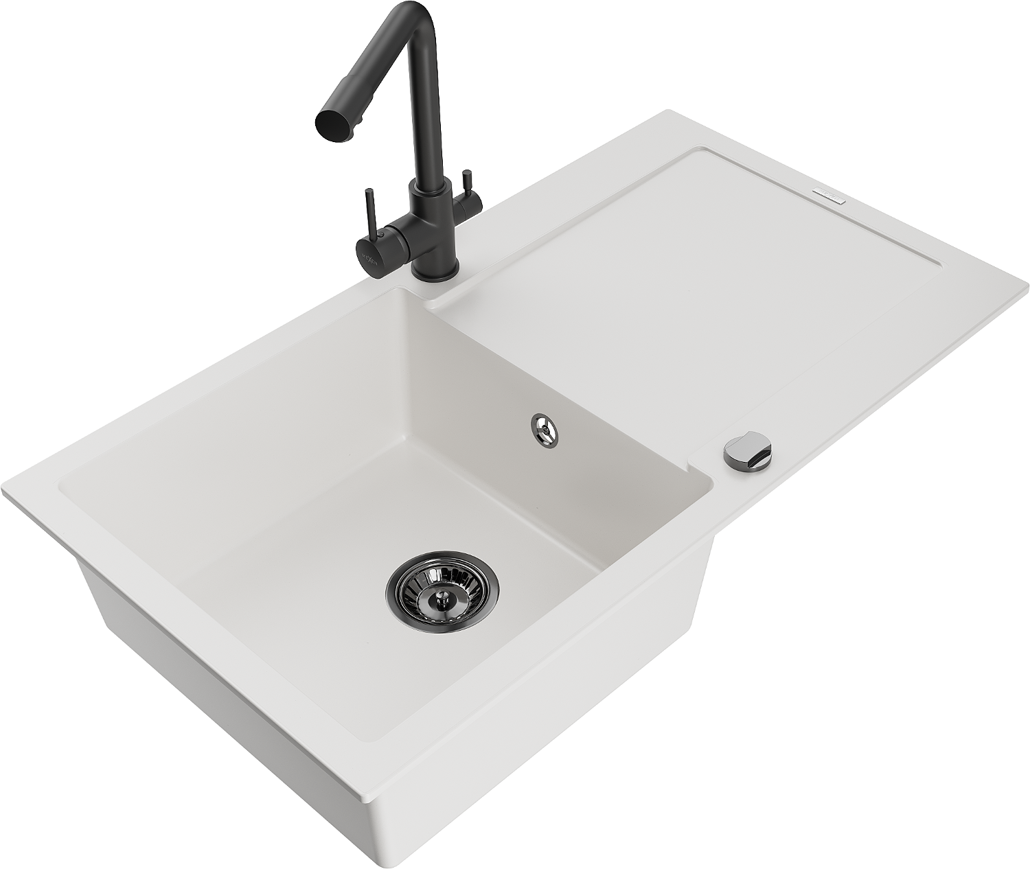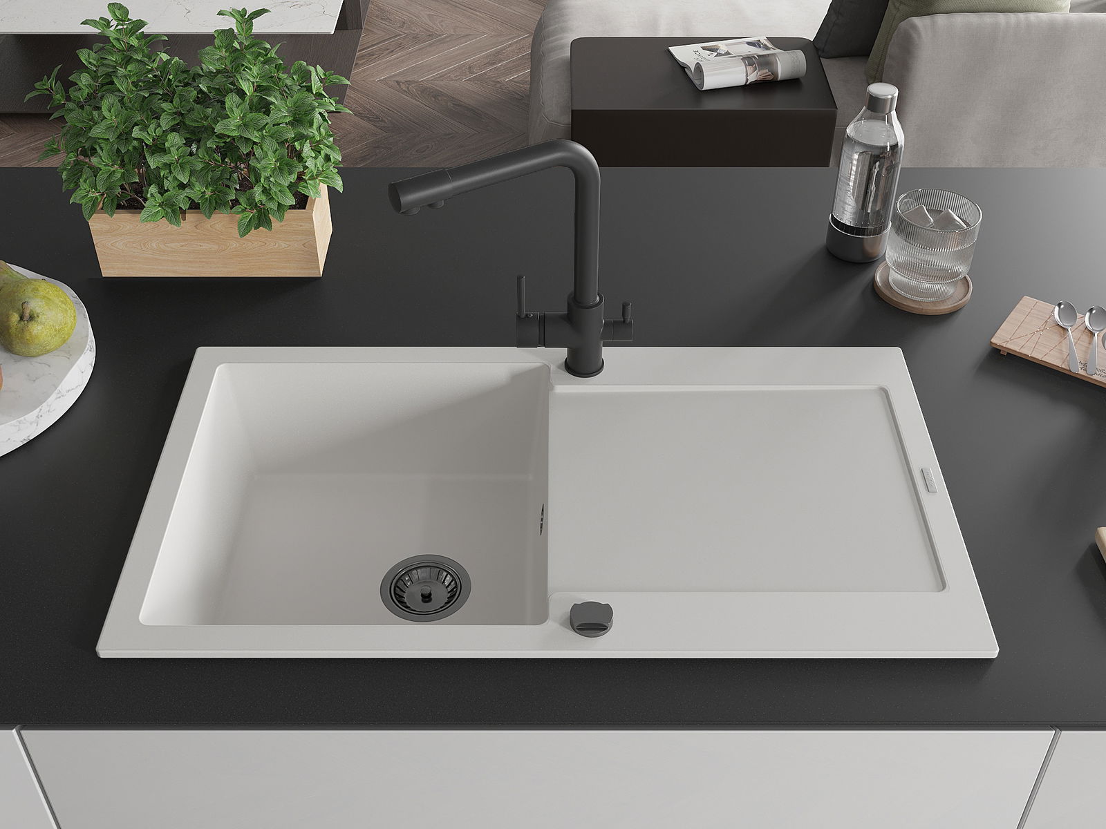 A mosogató magas minőségű gránitból készült. Elegáns, de mindenekelőtt praktikus kiegészítője minden konyhának, függetlenül annak stílusától. A gránit magas minősége és tartóssága hosszú távú használatot biztosít.