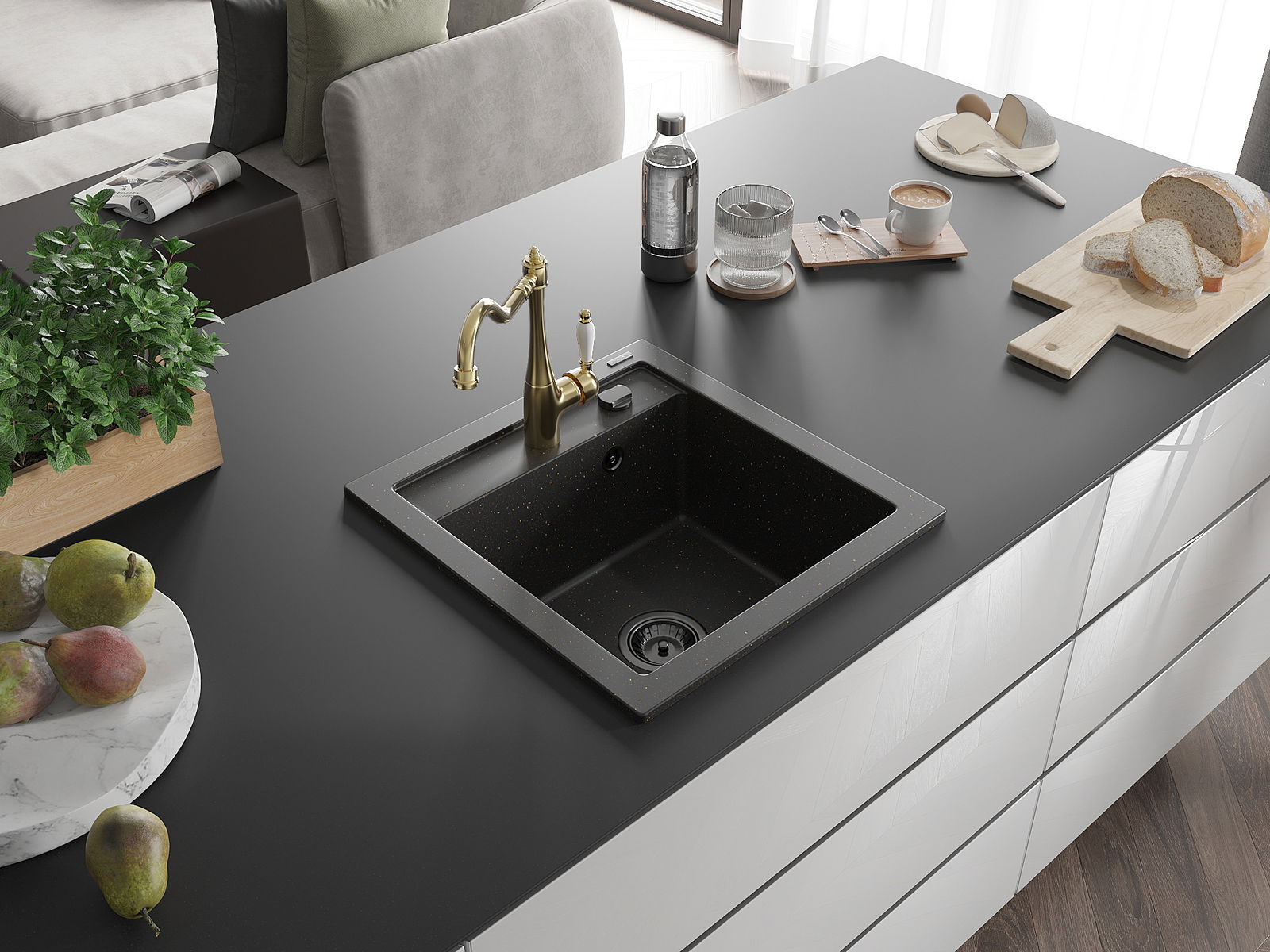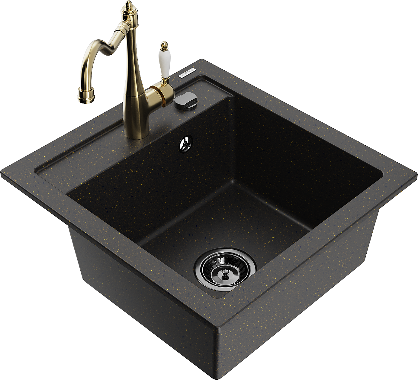 Mexen Vito gránit mosogató 1-medencés Carla konyhai csappal, fekete/arany metál - 6503-75-670700-50-B