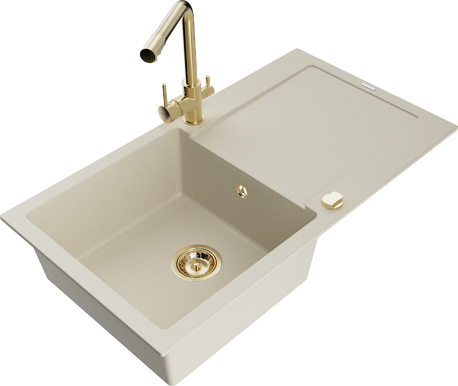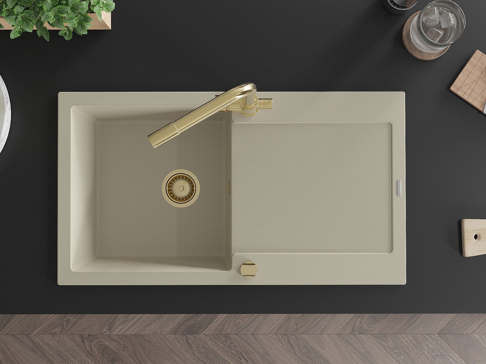 Mexen Leo gránit mosogató 1-medencés csepegtetővel és Duero konyhai csapteleppel, bézs - 6501-69-671600-50