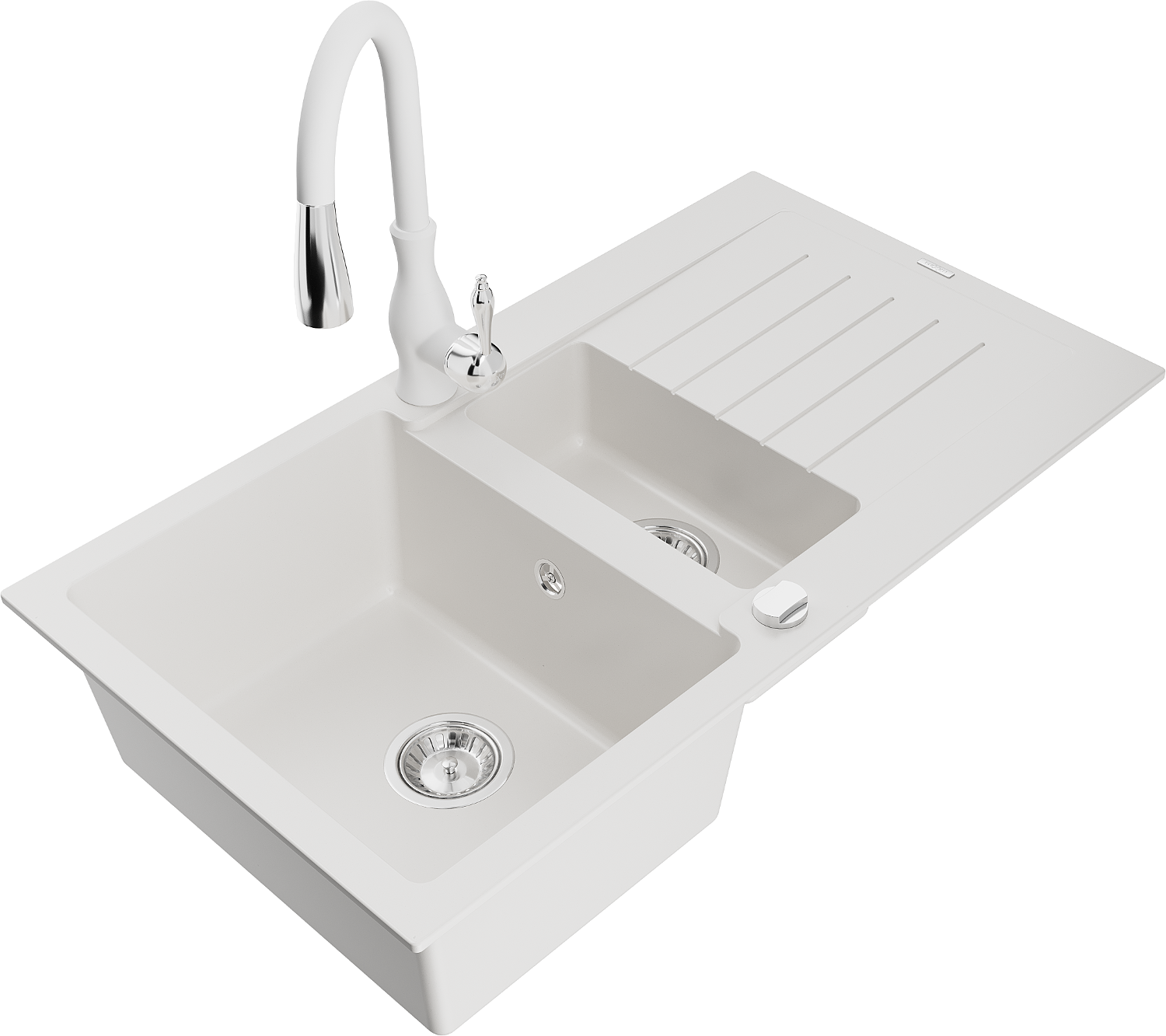 Mexen Matias 1,5 rekeszes gránit mosogató csepegtetővel és Savita konyhai csapteleppel, fehér - 6502-20-672601-20