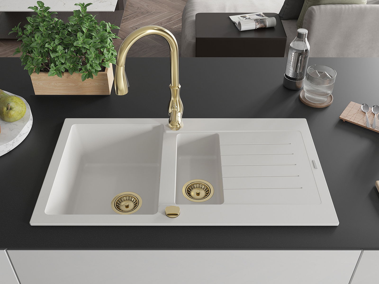 Mexen Matias 1,5-medencés gránit mosogató lefolyóval és Savita konyhai csapteleppel, fehér - 6502-20-672601-50