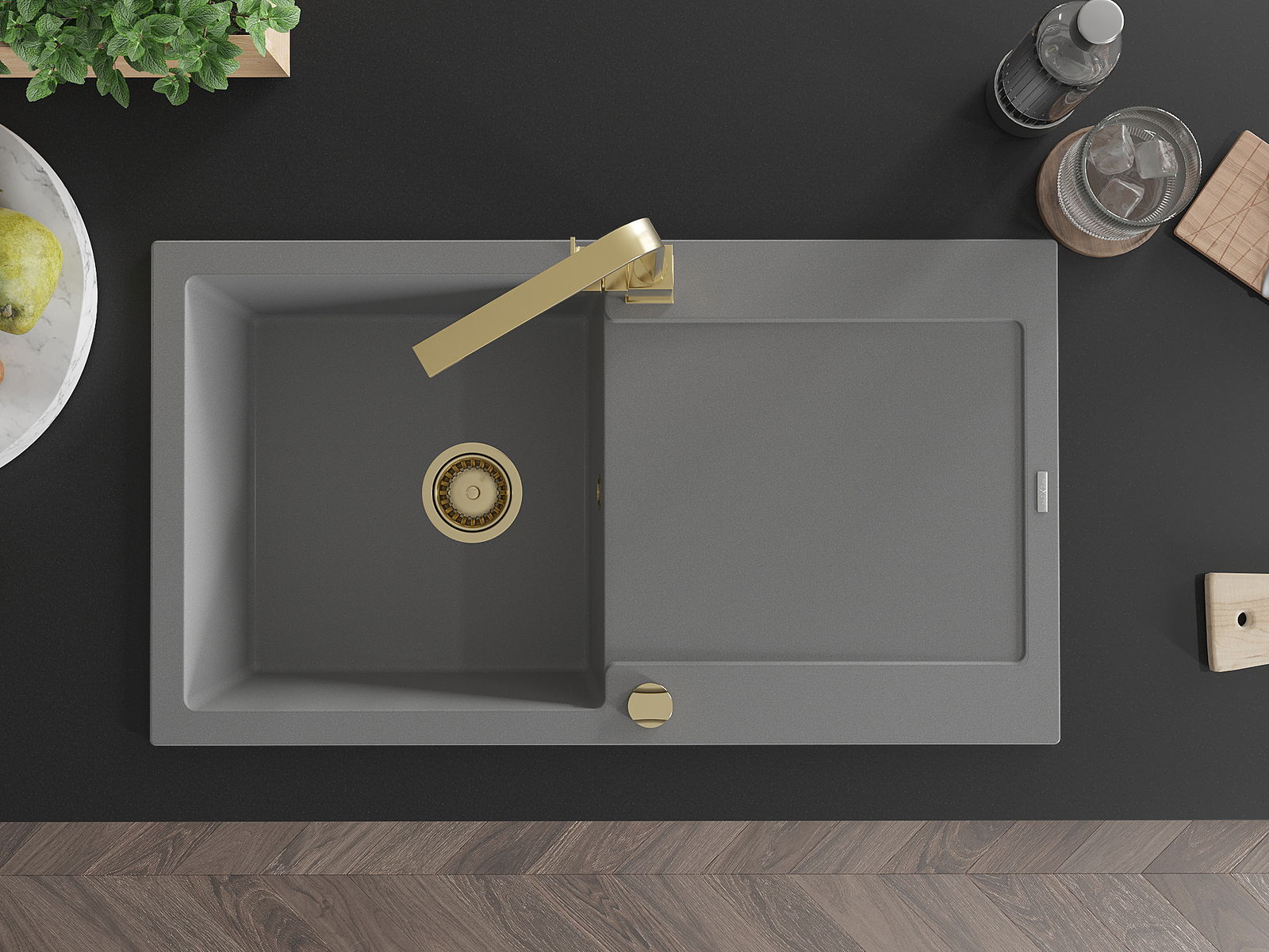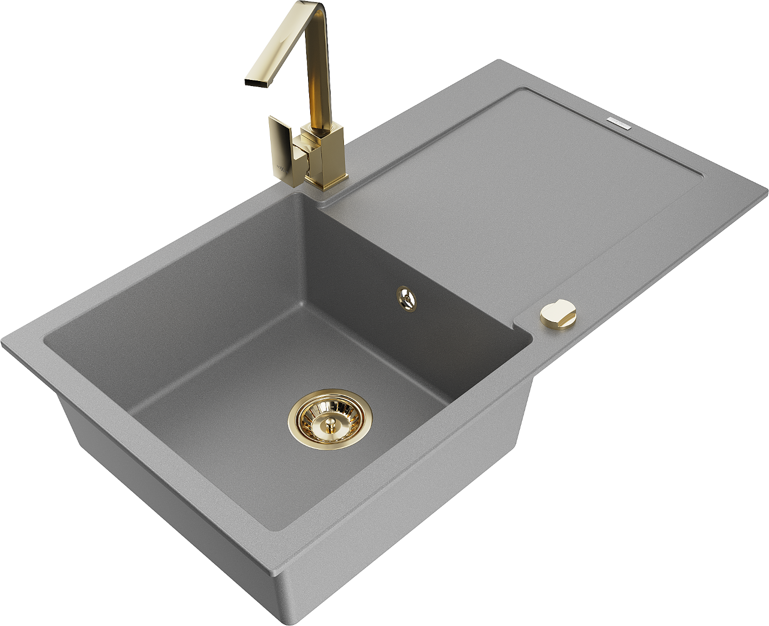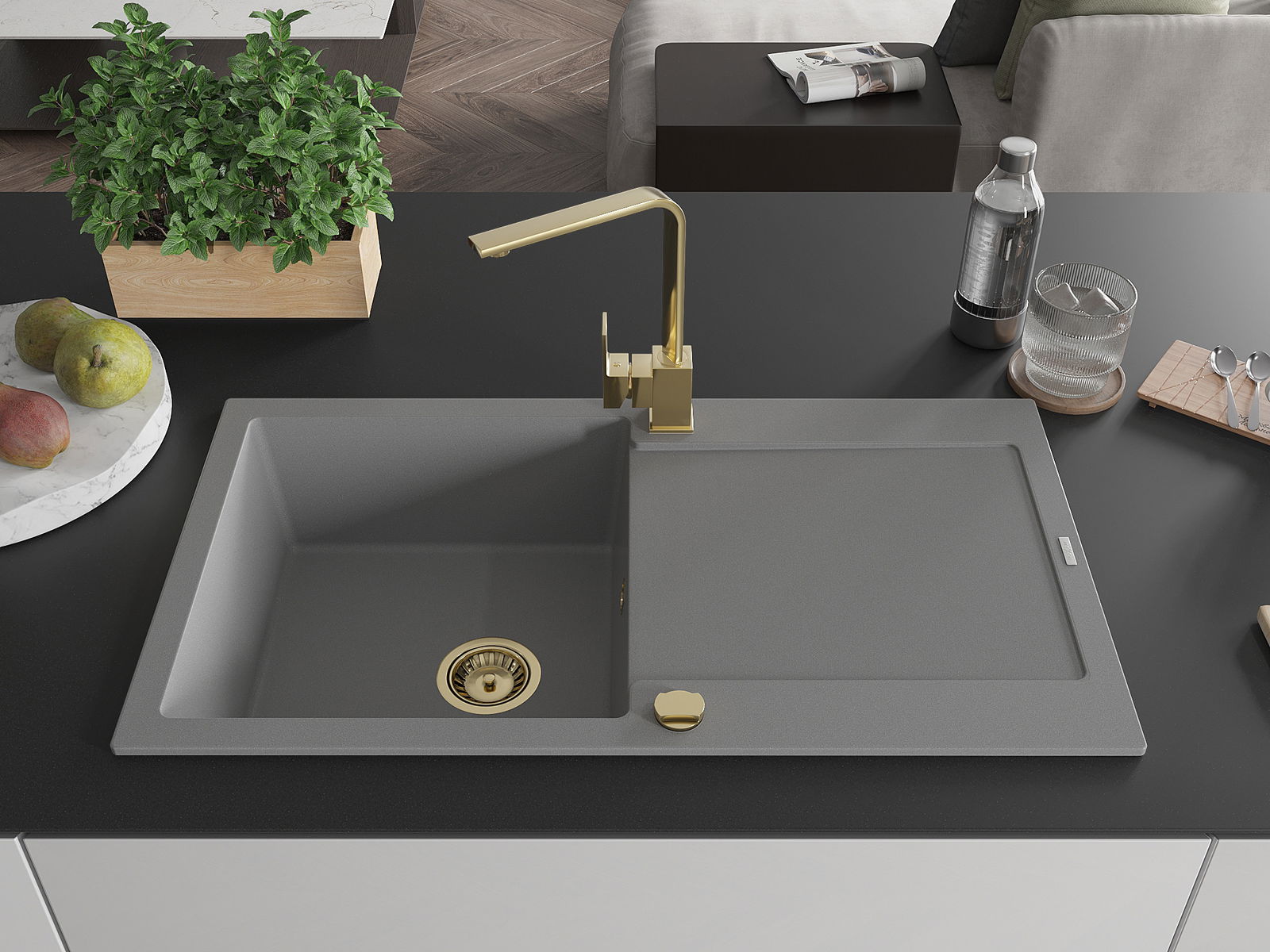 Mexen Leo egykamrás gránit mosogató csepegtetővel és Rita konyhai csapteleppel, szürke - 6501-71-670300-50
