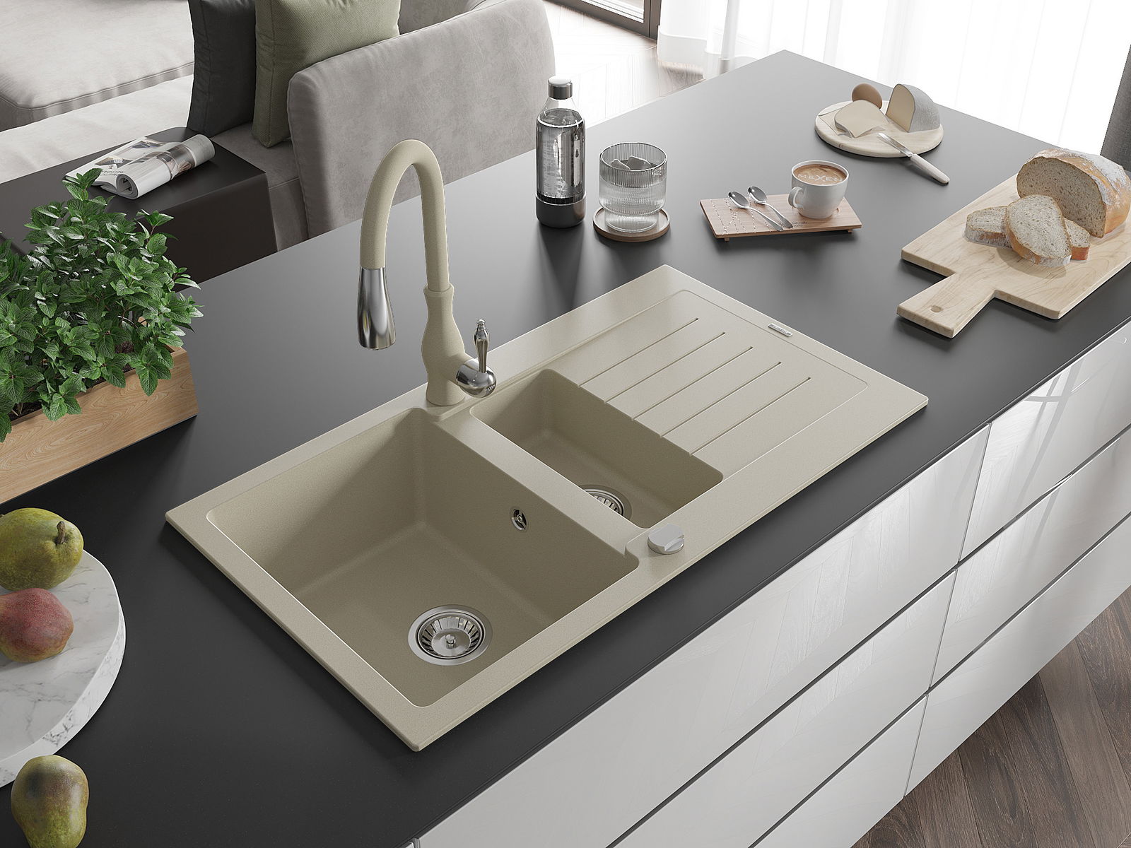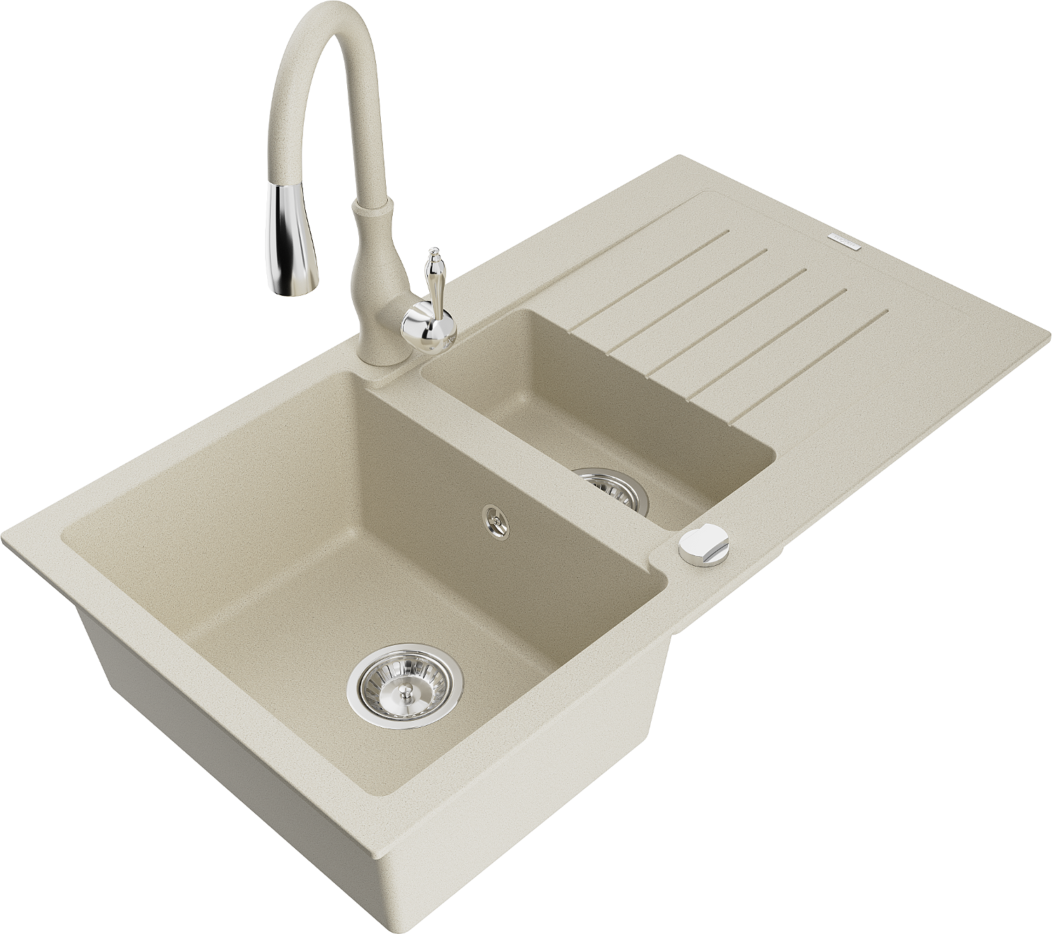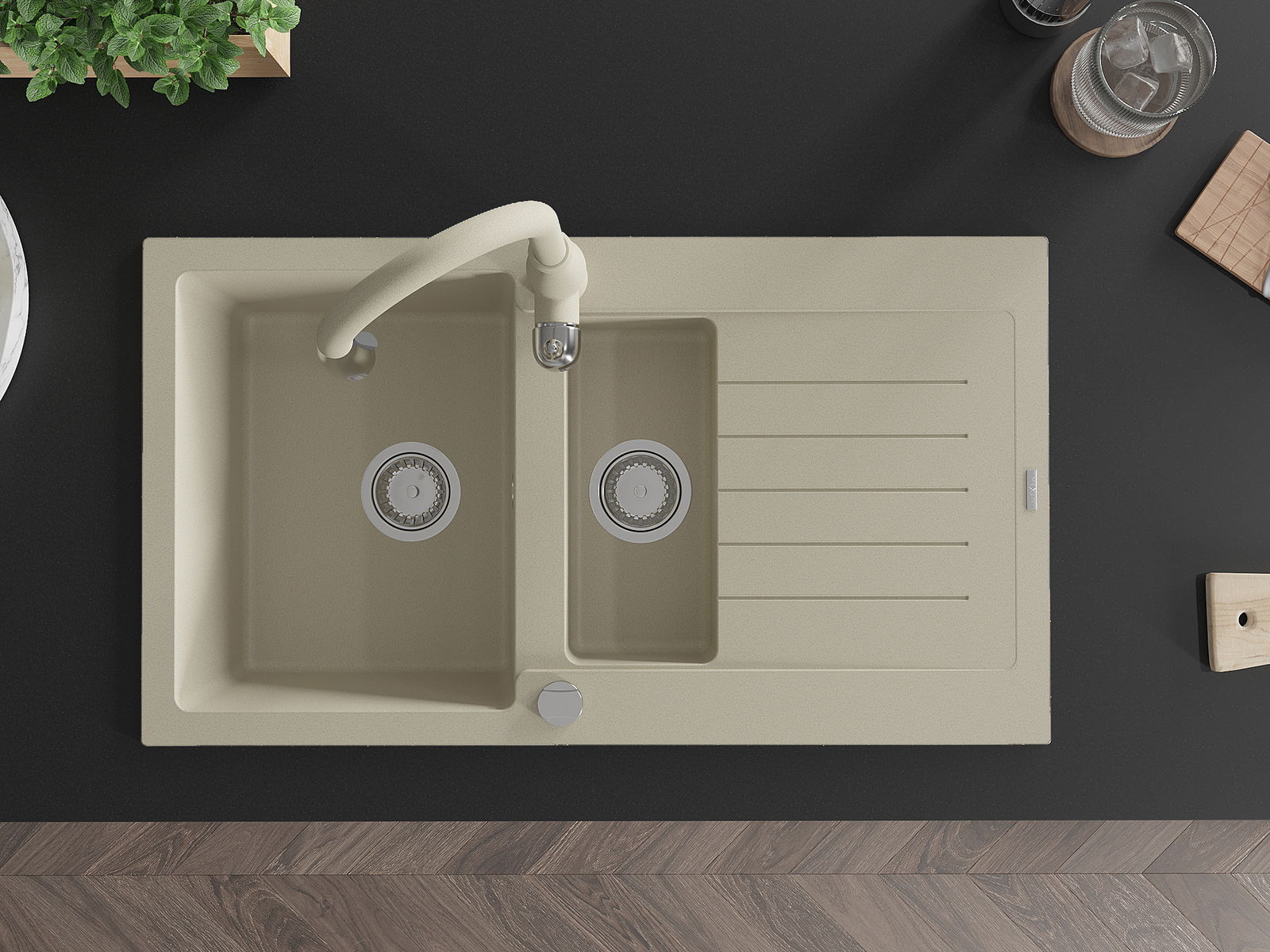 Mexen Matias gránit mosogató 1,5 rekeszes csepptálcával és Savita konyhai csapteleppel, bézs - 6502-69-672601-69
