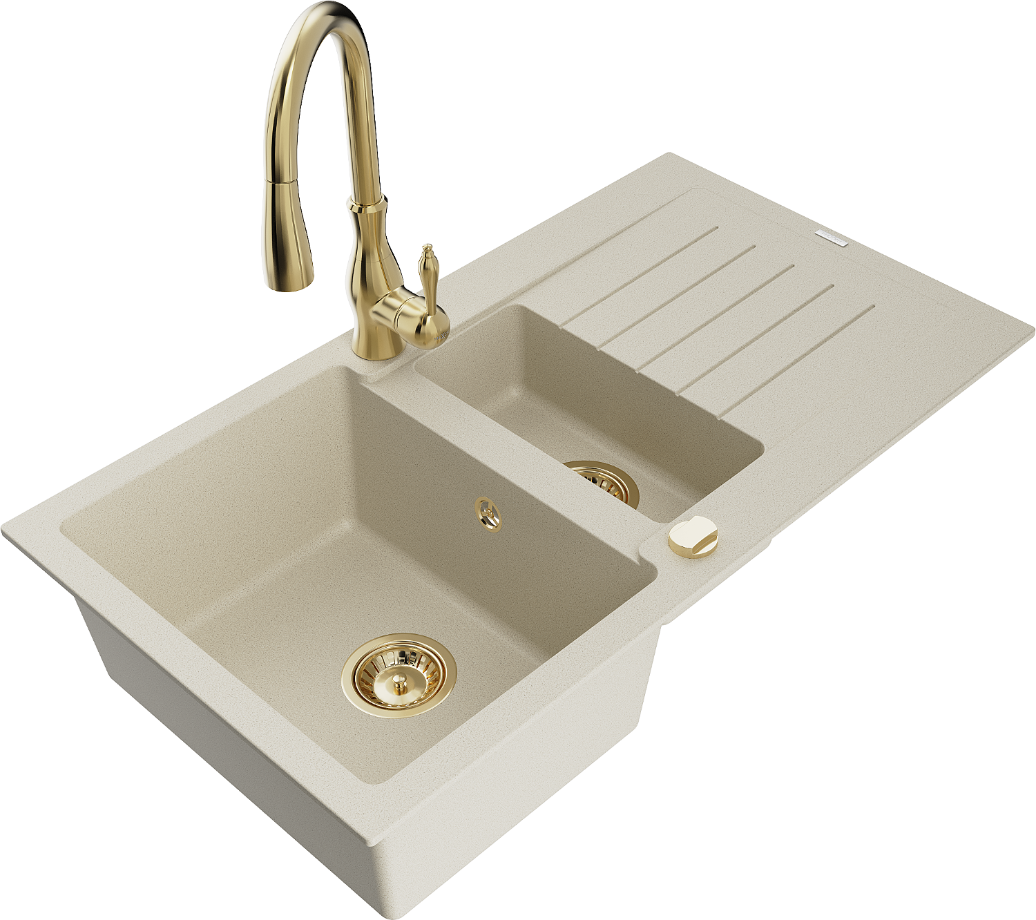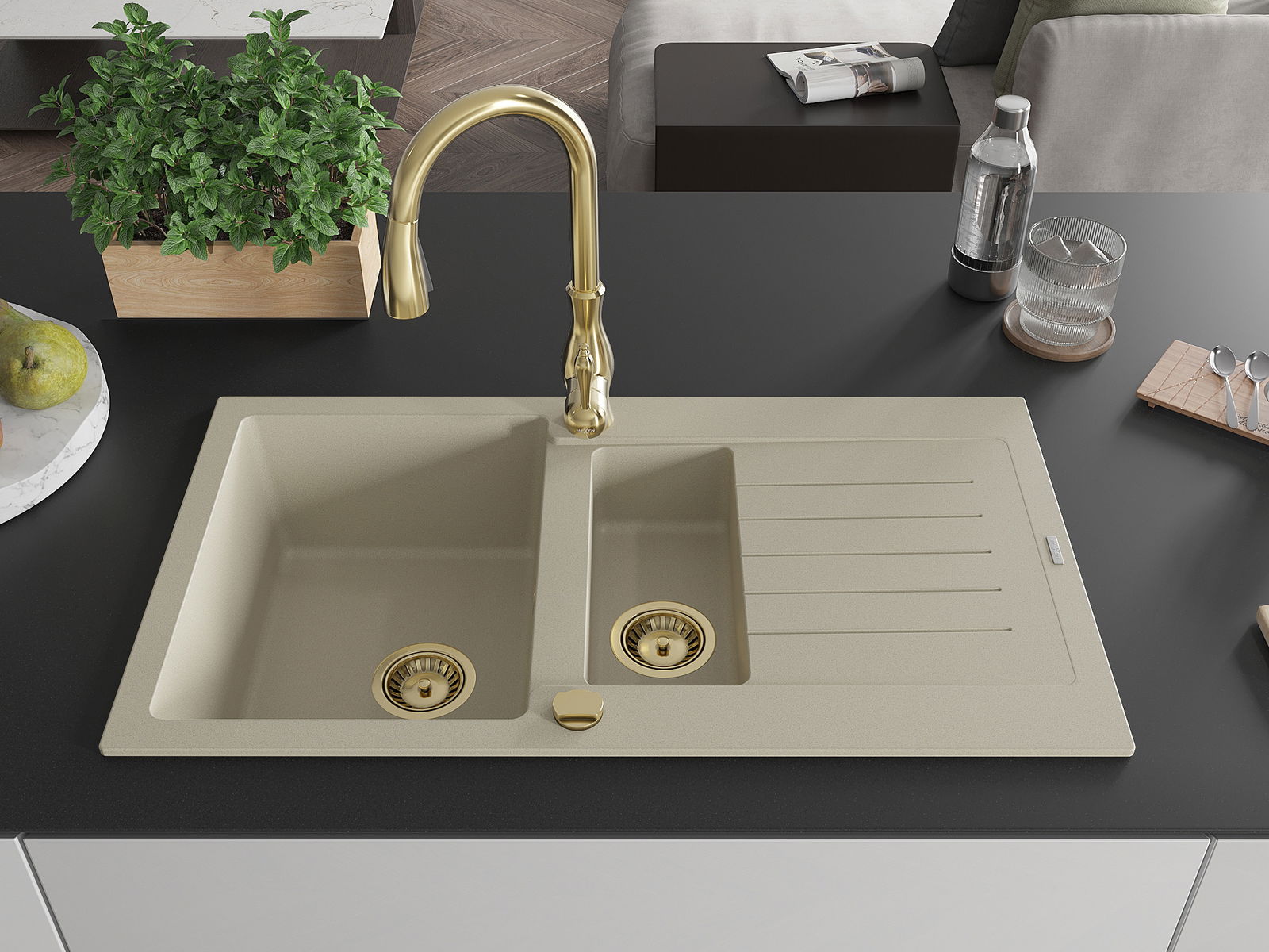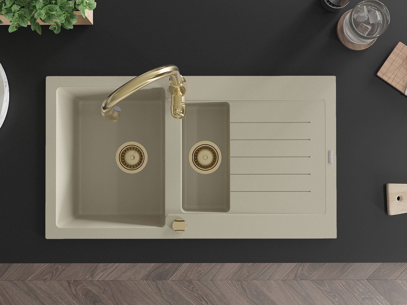 Mexen Matias 1,5-medencés gránit mosogató lefolyóval és Savita konyhai csapteleppel, bézs - 6502-69-672601-50