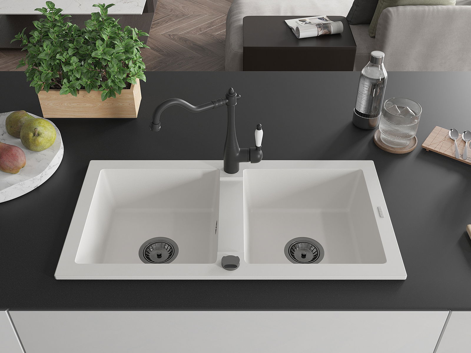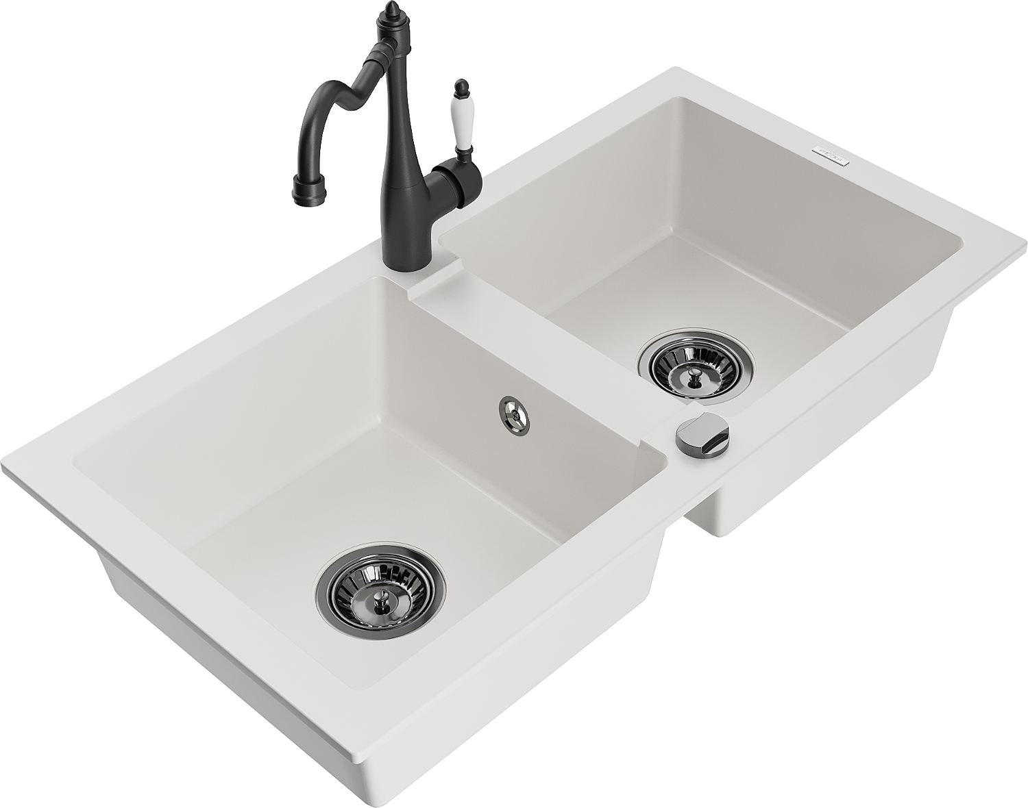 Mexen Mario 2 kamrás gránit mosogató Carla konyhai csapteleppel, fehér - 6504-20-670700-70
