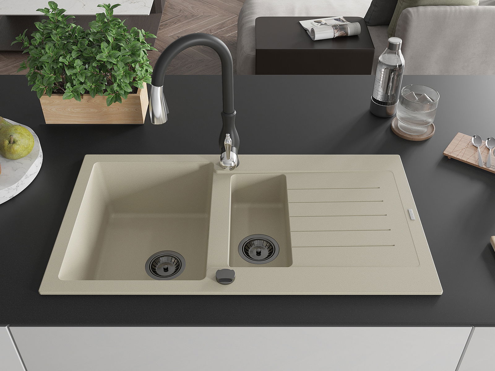 A mosogató kiváló minőségű gránitból készül. Ez egy elegáns és mindenekelőtt minden konyhához praktikus kiegészítés, stílusától függetlenül. A kiváló minőségű és a gránit tartósság biztosítja a sok éves használatát.