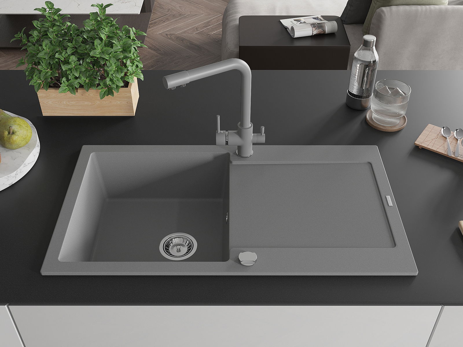 Mexen Leo egymedencés gránit mosogató csepegtetőkkel és Duero konyhai csapteleppel, szürke - 6501-71-671600-71