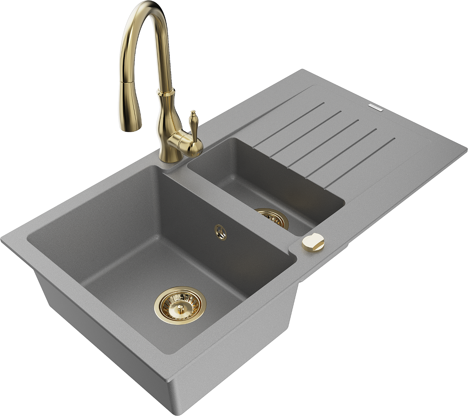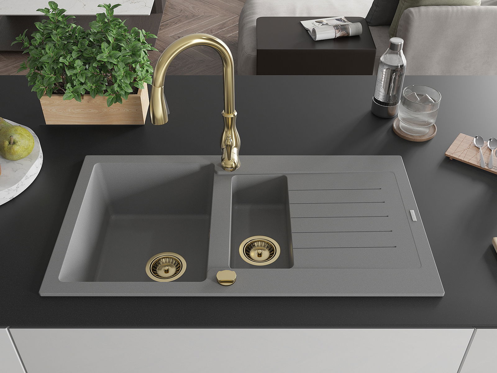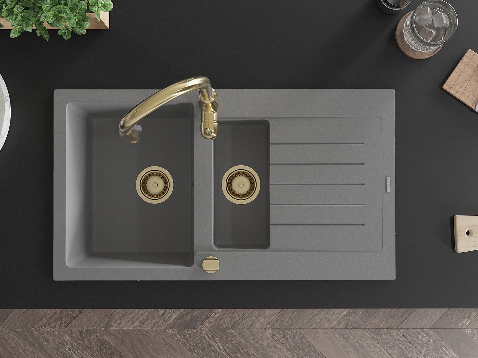 Mexen Matias 1,5-kamrás gránit mosogató csepegtetővel és Savita konyhai csapteleppel, szürke - 6502-71-672601-50