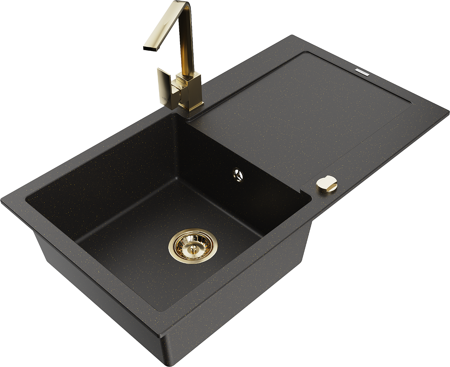 Mexen Leo 1-medencés gránit mosogató lefolyóval és Rita konyhai csapteleppel, fekete/arany metál - 6501-75-670300-50