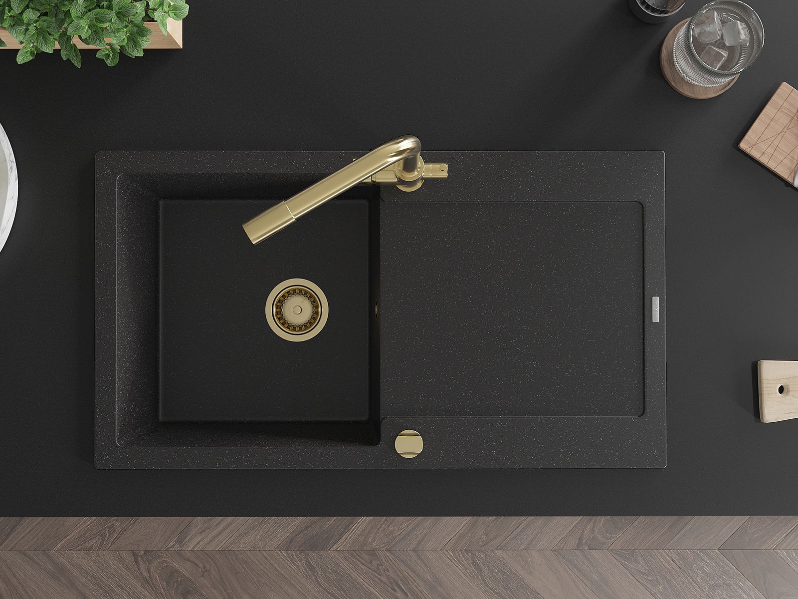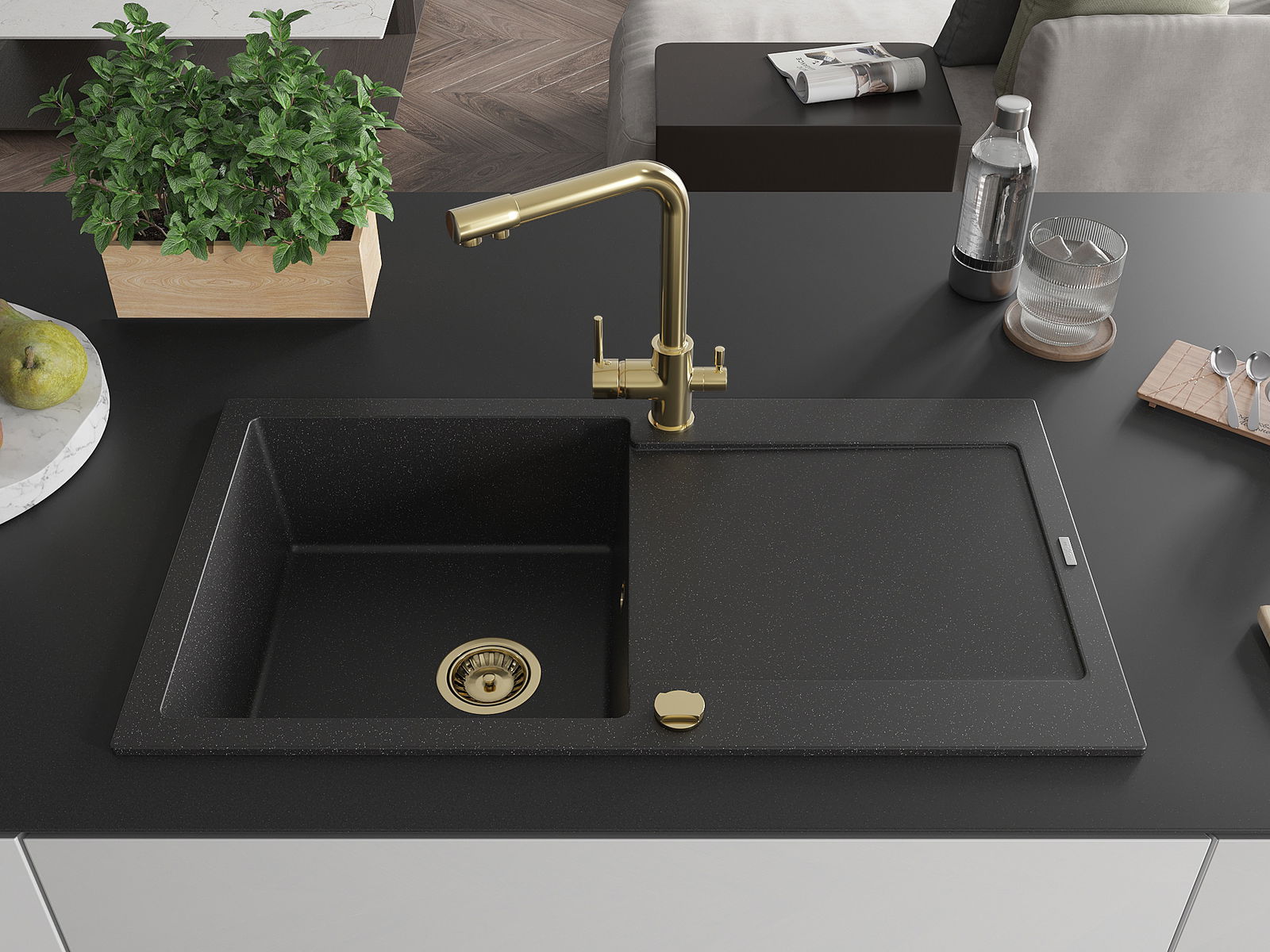 Mexen Leo egymedencés gránit mosogató csepegtetővel és Duero konyhai csapteleppel, fekete/ezüst metál - 6501-73-671600-50