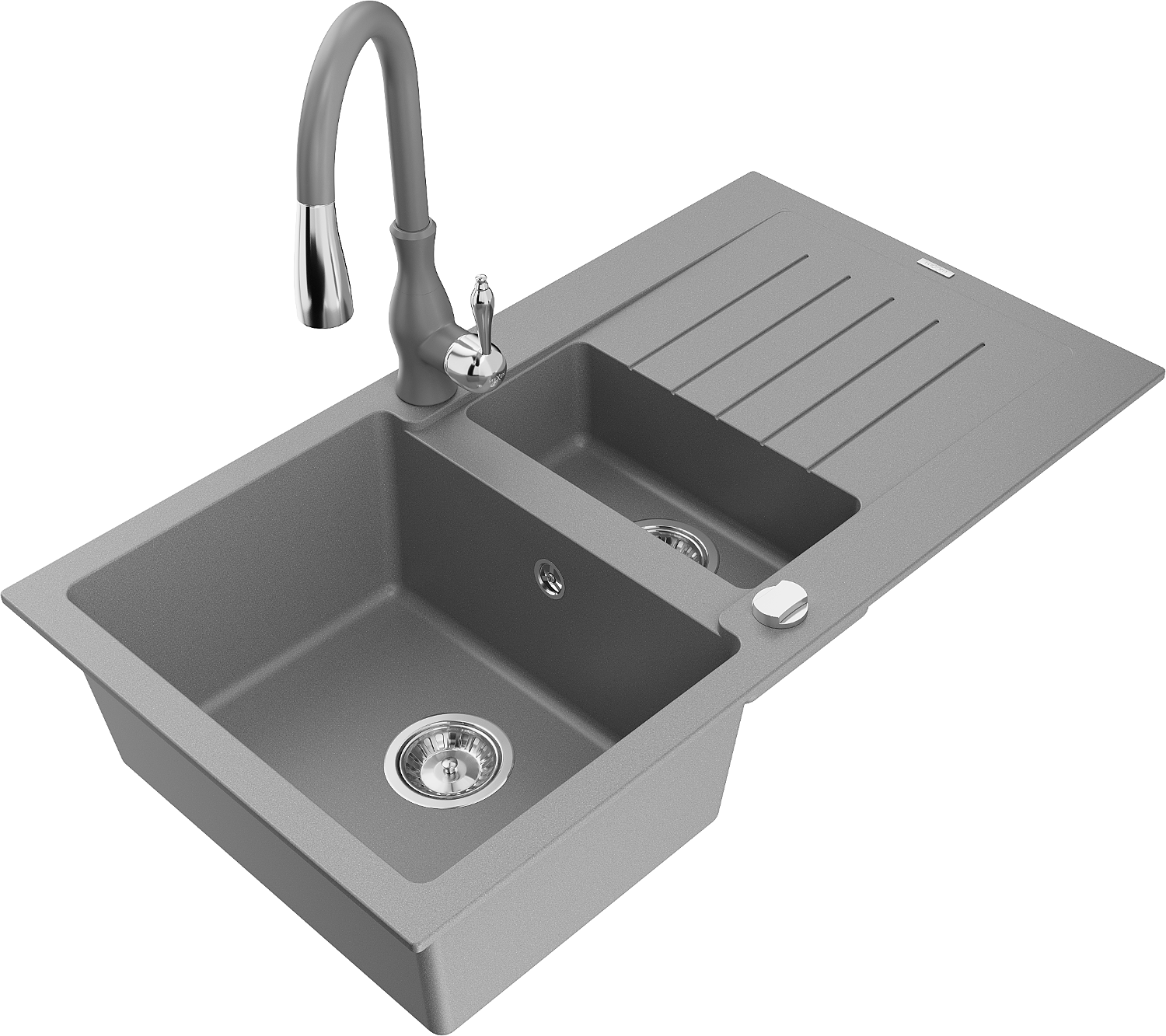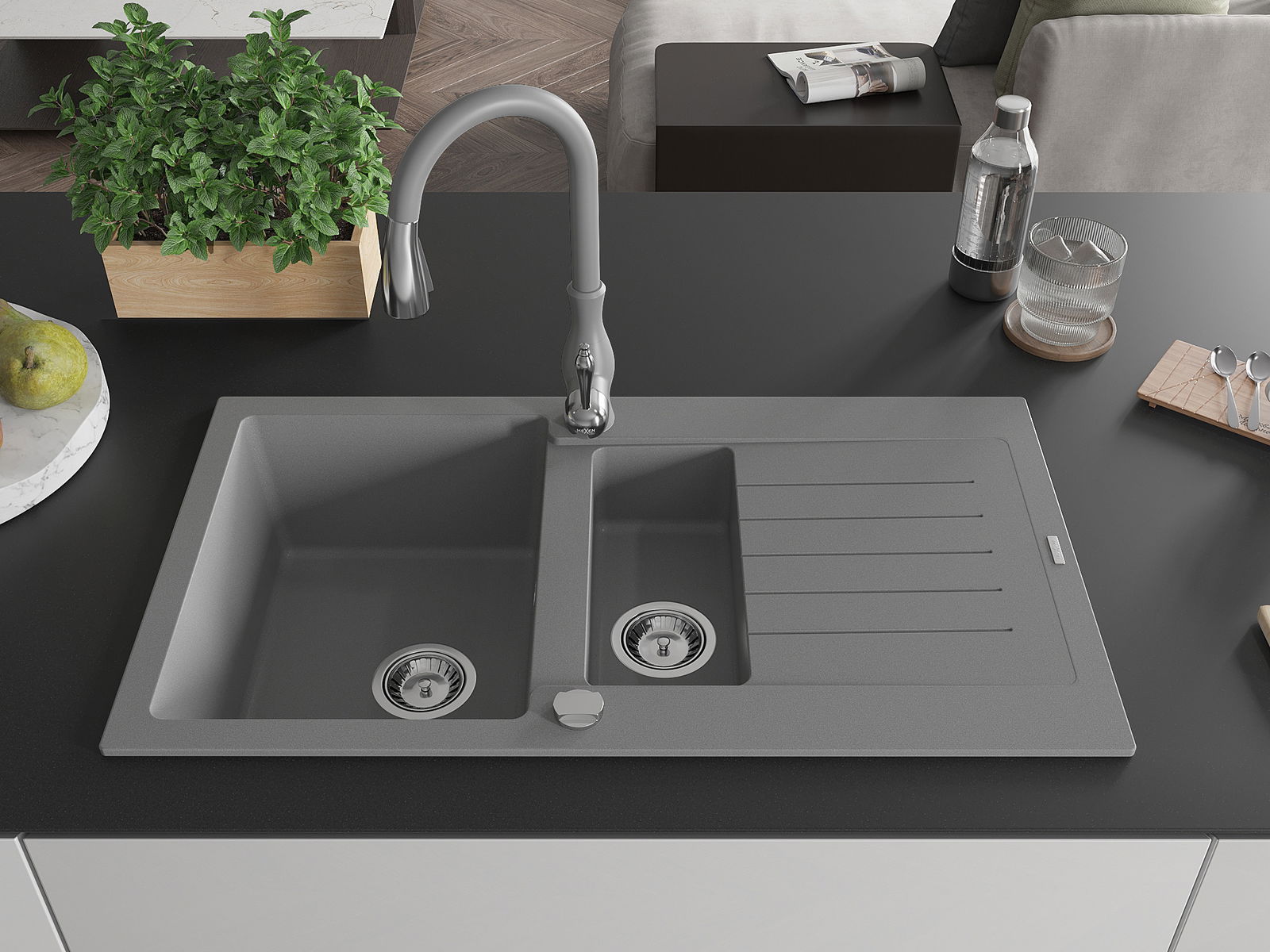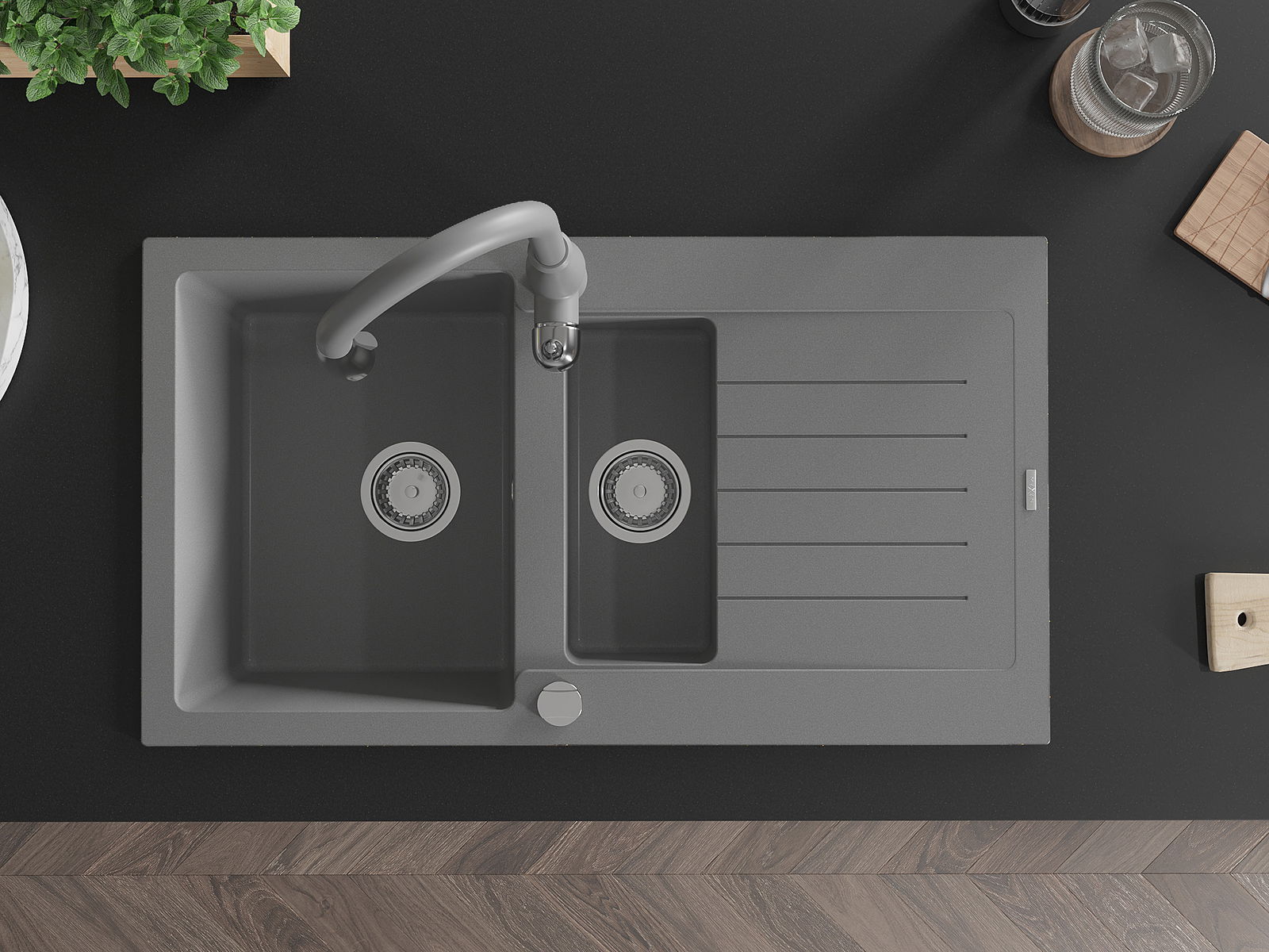 Mexen Matias gránit 1,5 rekeszes mosogató csepegtetővel és Savita konyhai csapteleppel, szürke - 6502-71-672601-71