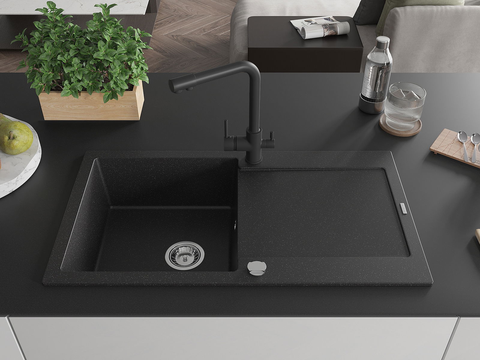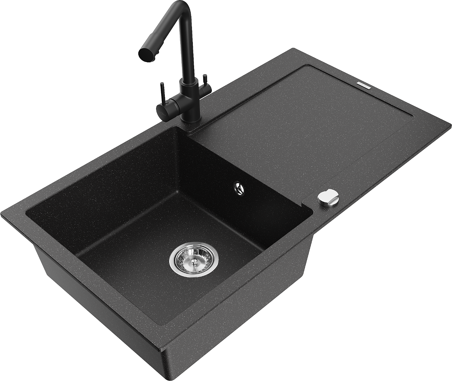 Mexen Leo 1 rekeszes gránit mosogató csepegtetővel és Duero konyhai csappal, fekete/ezüst metál - 6501-73-671600-70