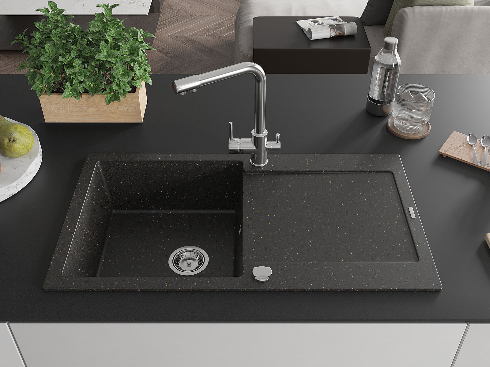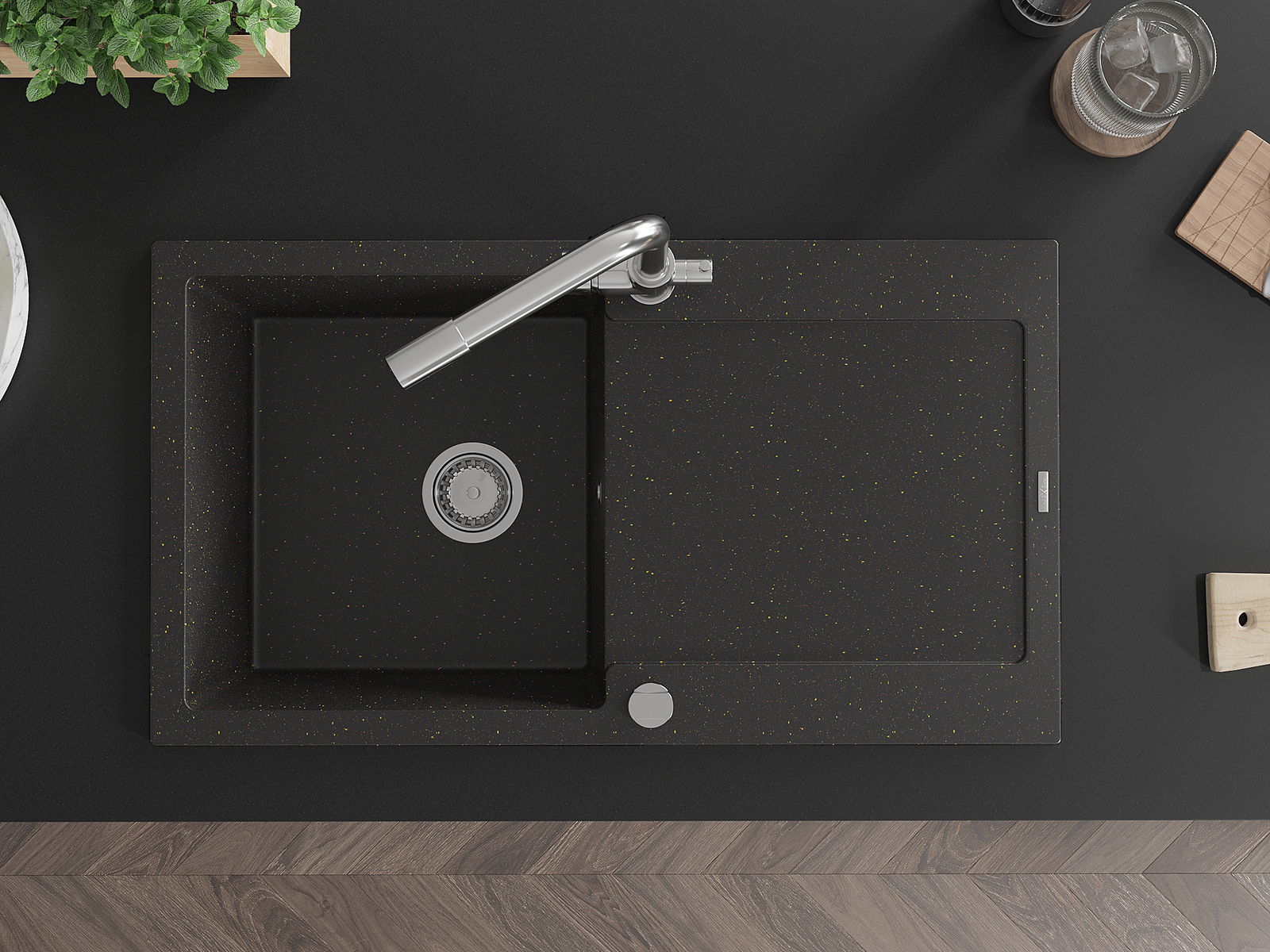 A mosogató magas minőségű gránitból készült. Elegáns, de mindenekelőtt praktikus kiegészítője minden konyhának, függetlenül annak stílusától. A gránit magas minősége és tartóssága hosszú távú használatot biztosít.