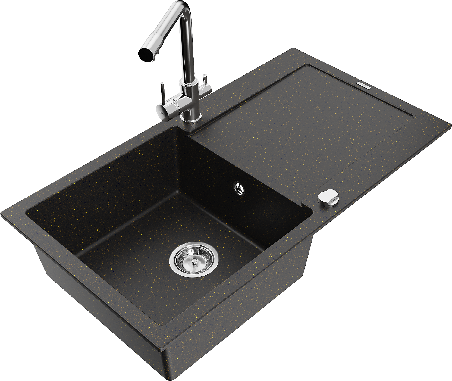 Mexen Leo gránitmosogató 1-medencés csepegtetővel és Duero konyhai csappal, fekete/arany metál - 6501-75-671600-00