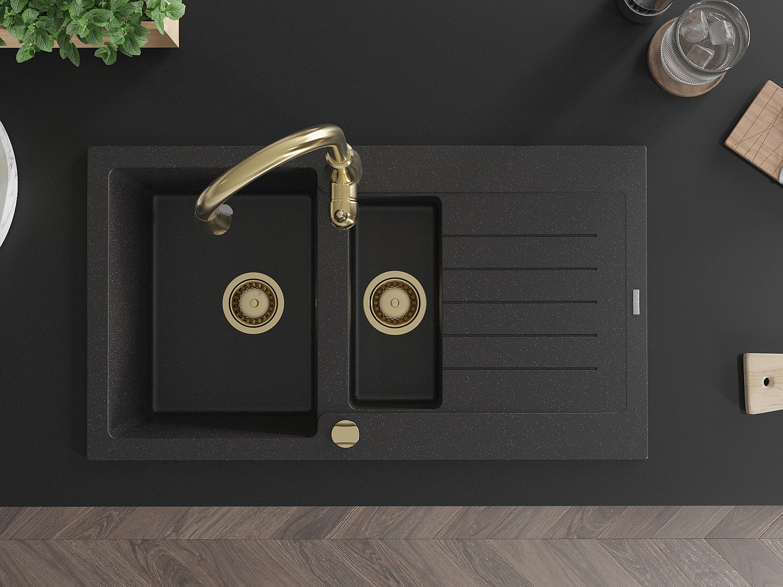Mexen Matias gránit mosogató 1,5 medencés csepegtetővel és Savita konyhai csappal, fekete/ezüst - 6502-73-672601-50