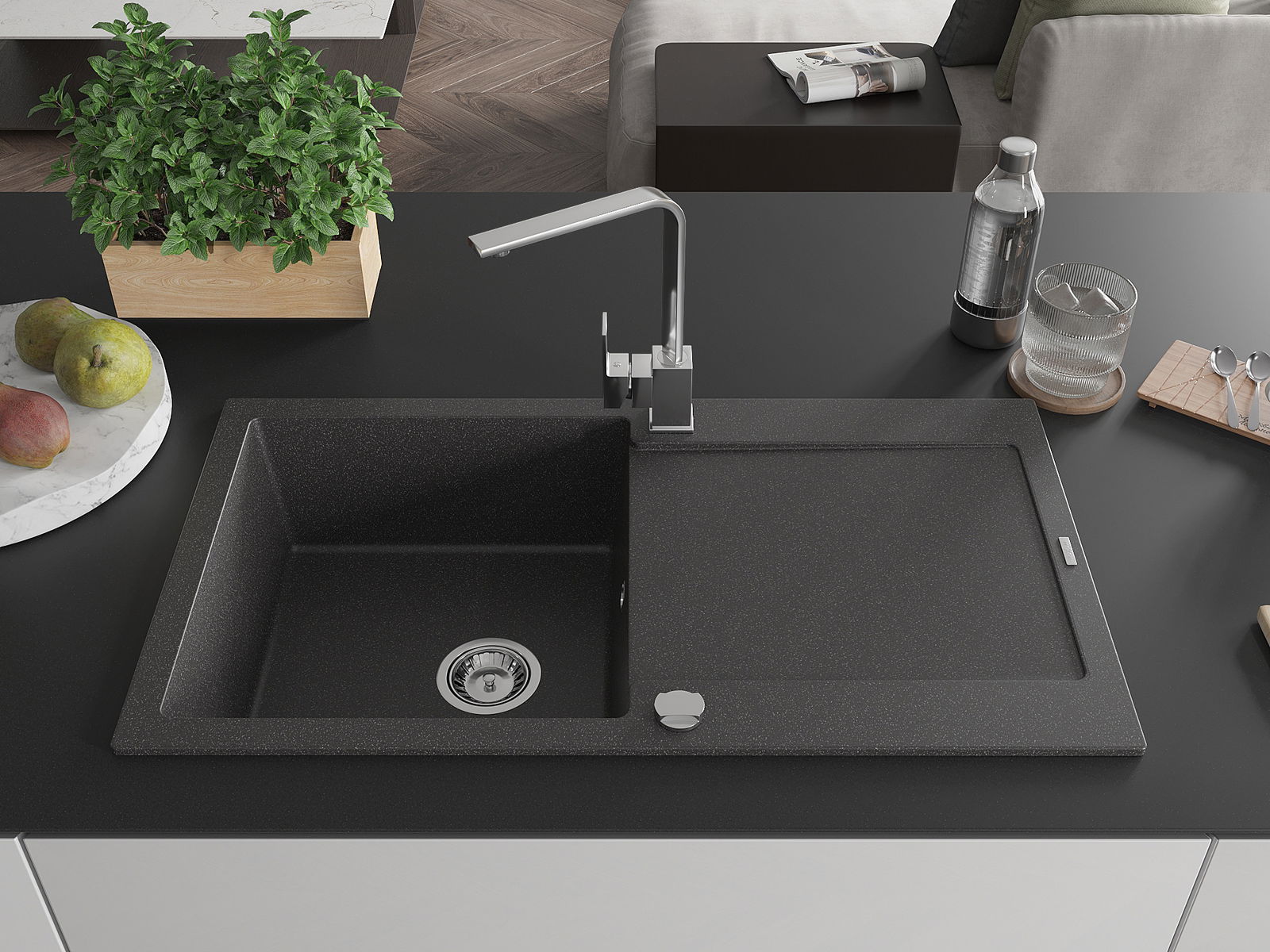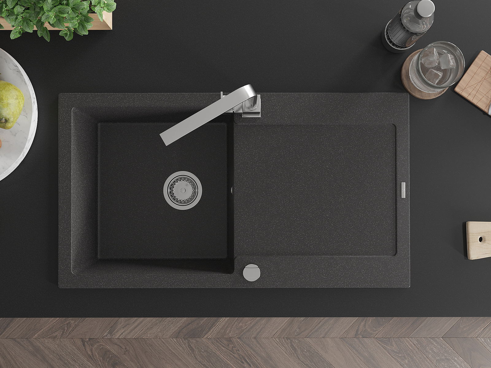 A mosogató magas minőségű gránitból készült. Elegáns, de mindenekelőtt praktikus kiegészítője minden konyhának, függetlenül annak stílusától. A gránit magas minősége és tartóssága hosszú távú használatot biztosít.