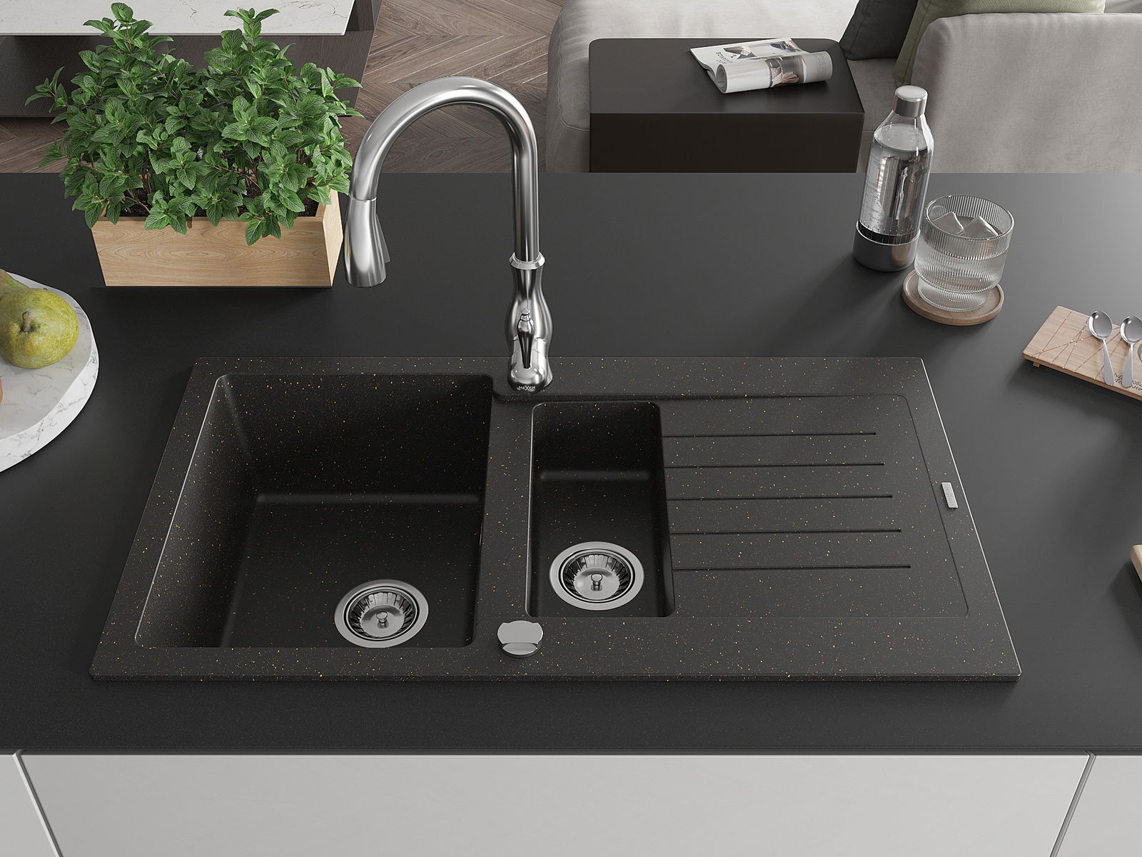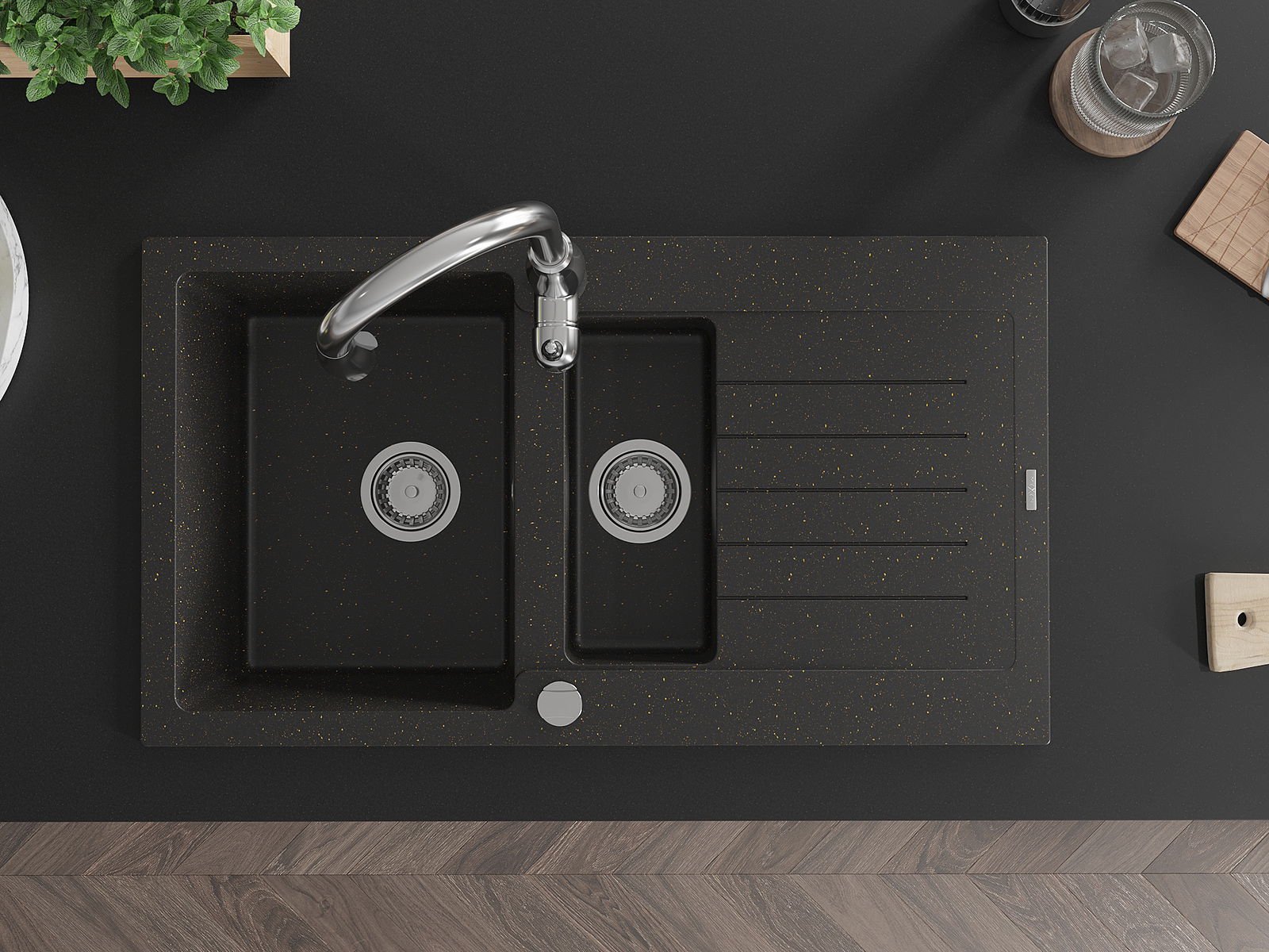 A mosogató 2 összekapcsolt lyukkal rendelkezik, amelynek átmérője 35 mm, önmagában. Felhasználhatók többek között Olyan folyékony adagoló rögzítéséhez, amely kiküszöböli a műanyag palackok jelenlétét a konyhában, és elegáns kivitelben adja meg.