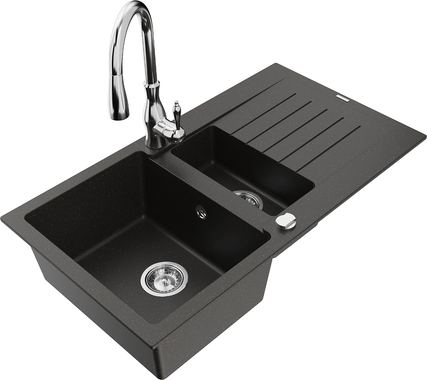 Mexen Matias gránit mosogató 1,5 kamrával, csepegtetővel és Savita konyhai csappal, fekete/arany - 6502-75-672601-00