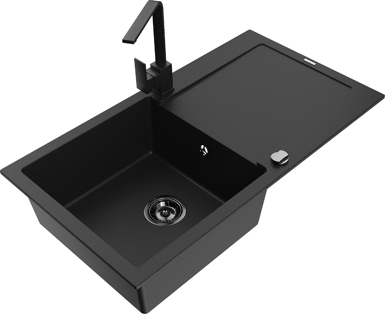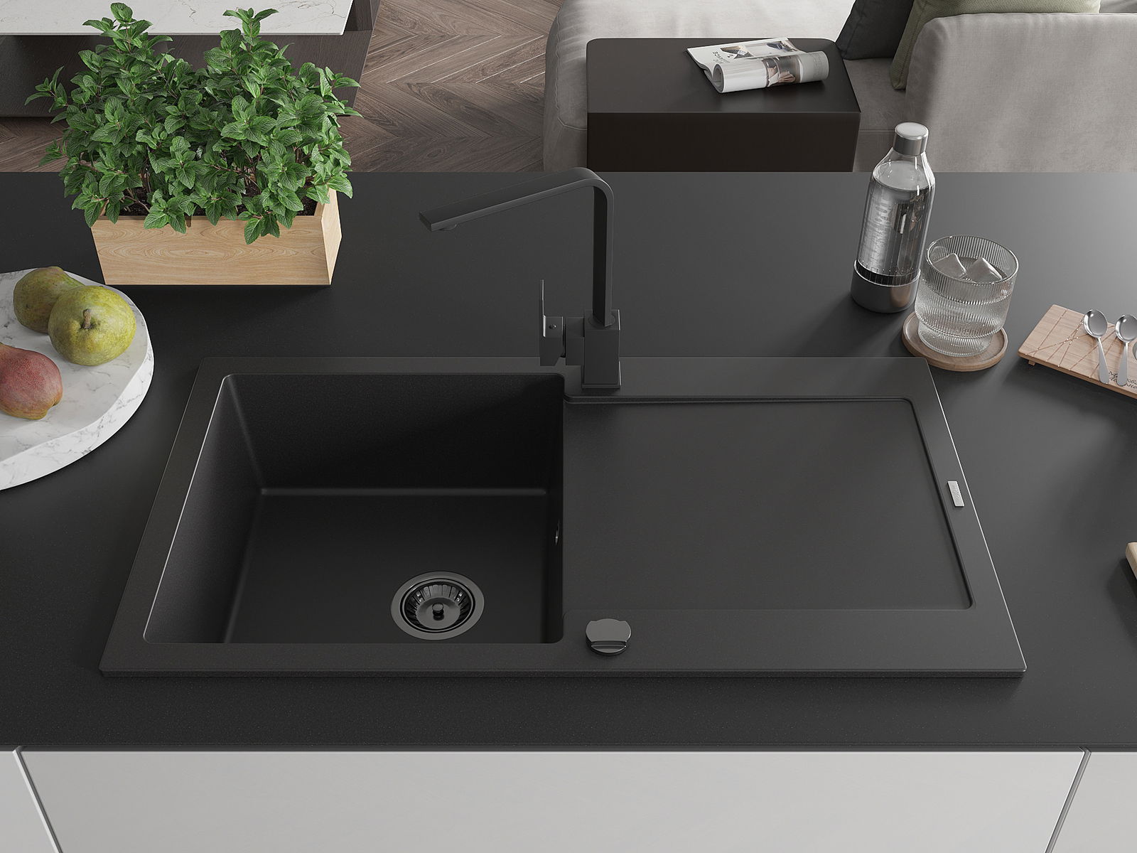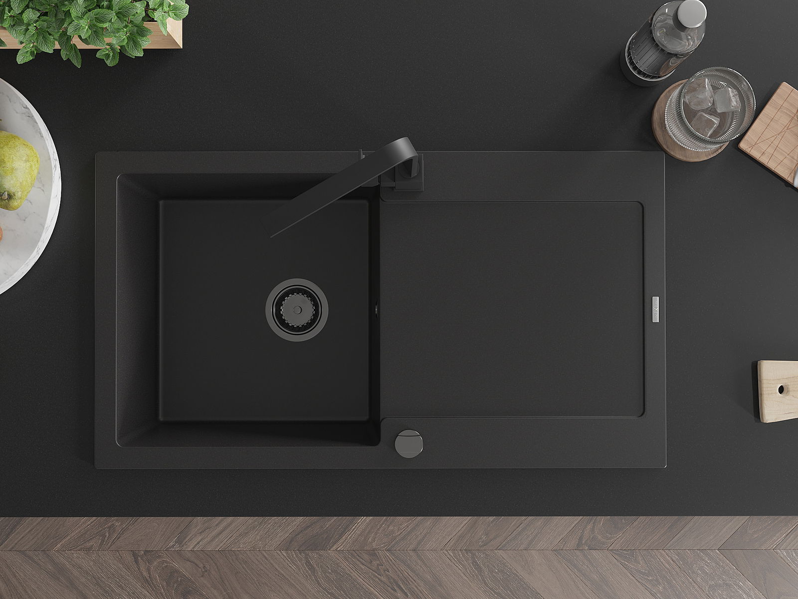 Mexen Leo egymedencés gránit mosogató csepegtetővel és Rita konyhai csapteleppel, fekete - 6501-77-670300-70-B