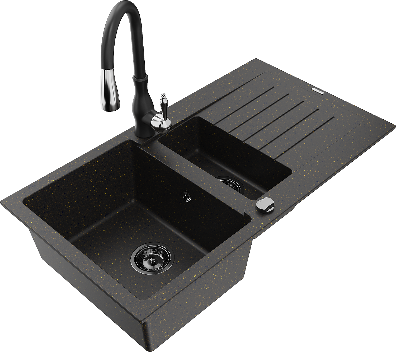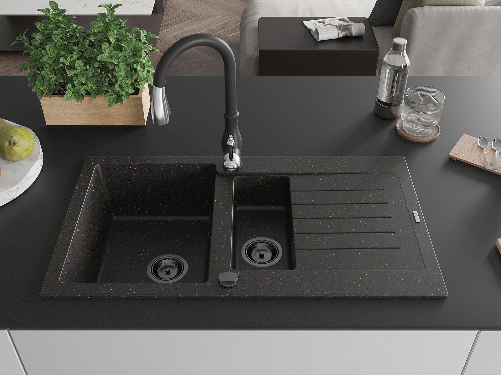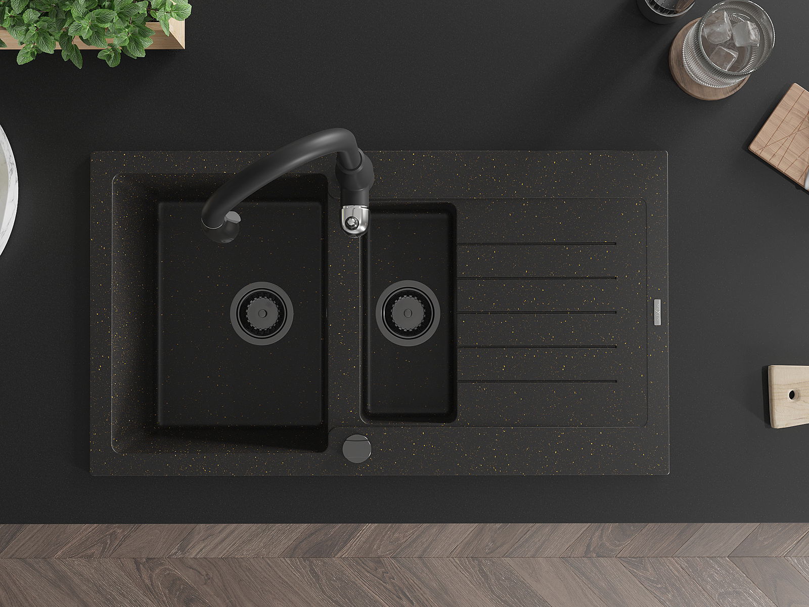 Mexen Matias gránit mosogató 1,5 medencés csepegtetővel és Savita konyhai csappal, fekete/arany - 6502-75-672601-70-B