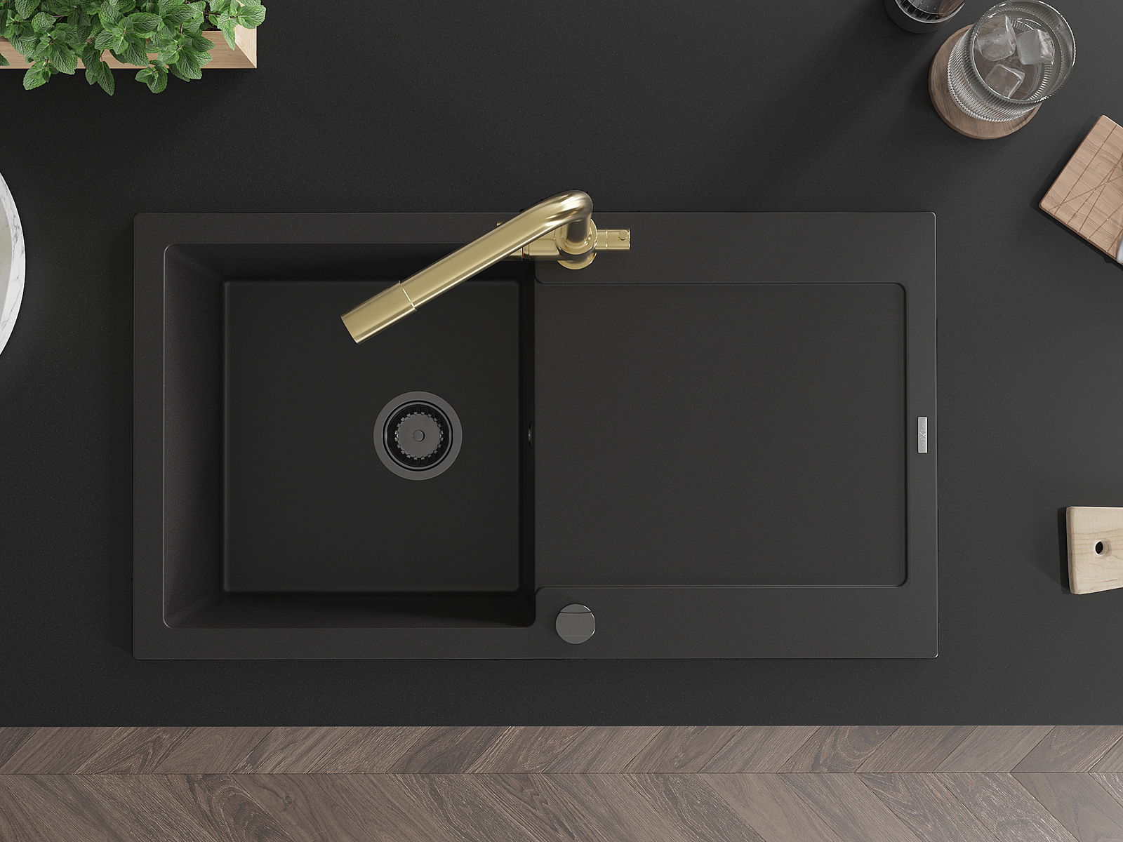 Mexen Leo 1-kamrás gránit mosogató csepegtetővel és Duero konyhai csapteleppel, fekete - 6501-77-671600-50-B