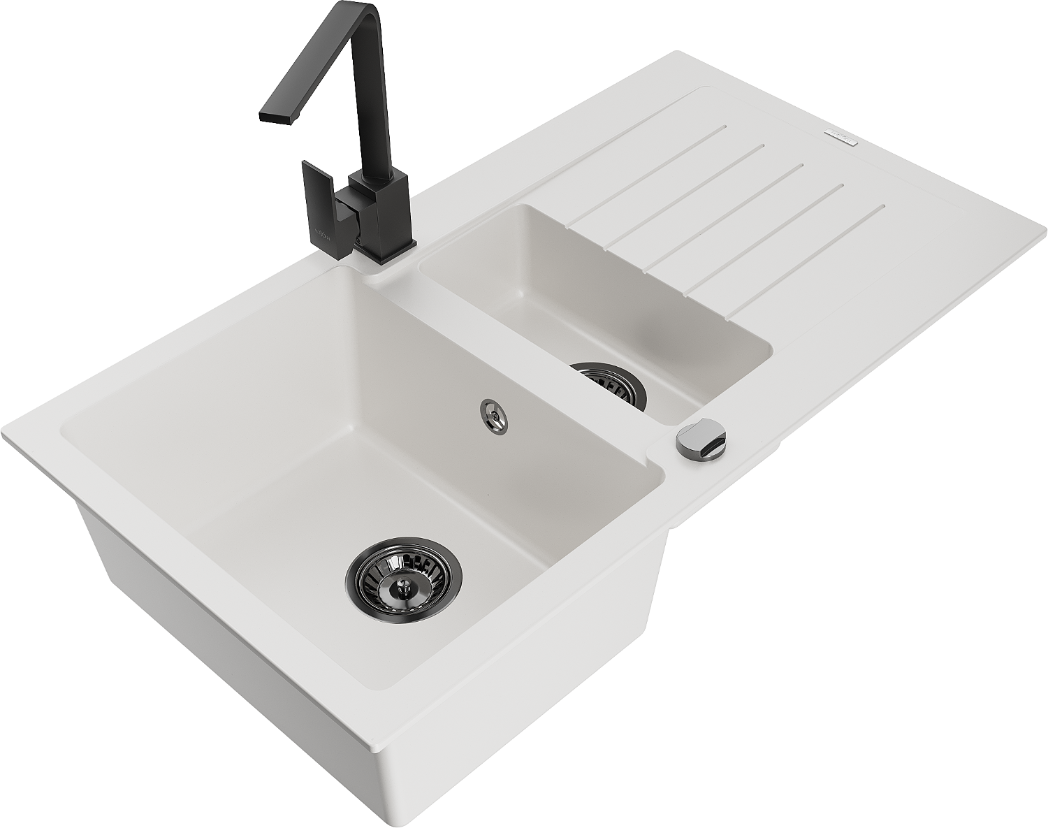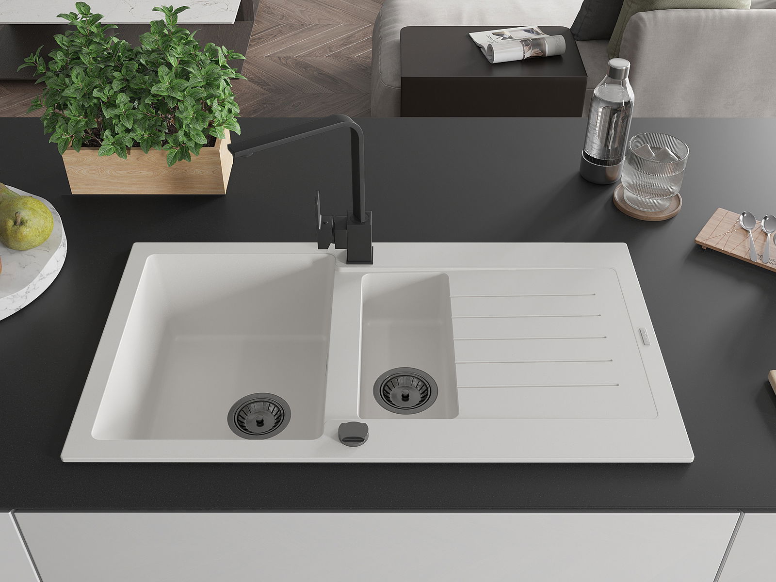 Mexen Matias gránit mosogató 1,5 rekeszes csepegtetővel és Rita konyhai csapteleppel, fehér - 6502-20-670300-70