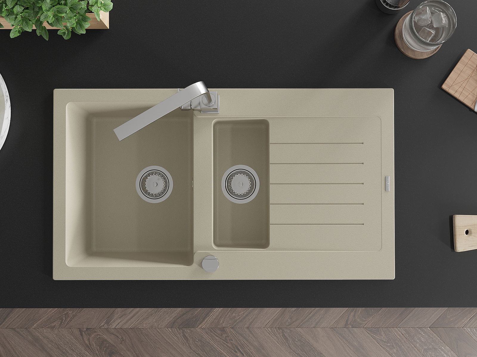 Mexen Matias gránit mosogató 1,5 rekeszes csepptálcával és Rita konyhai csapteleppel, bézs - 6502-69-670300-00