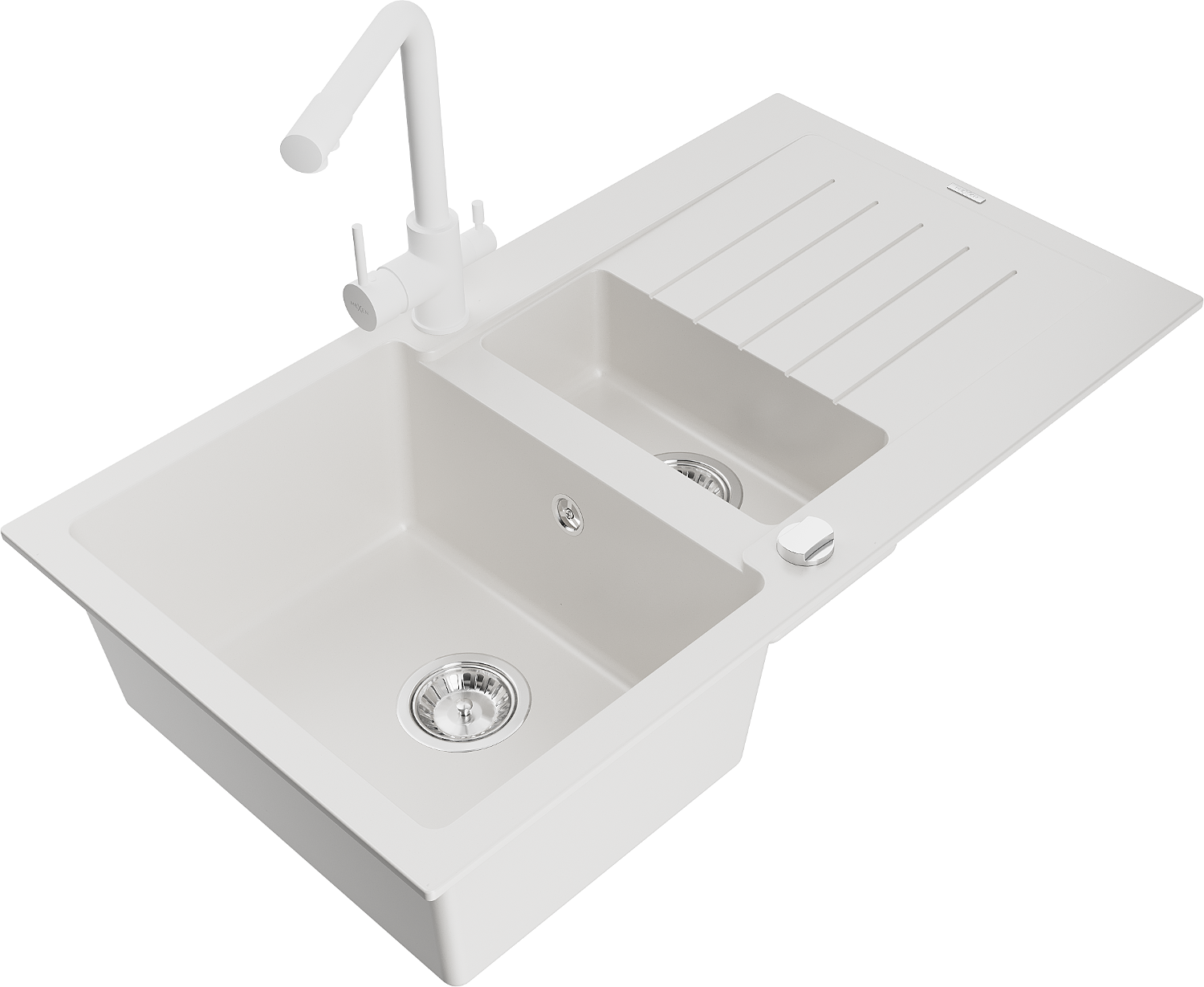 Mexen Matias gránit mosogató 1,5 rekeszes csepegtetővel és Duero konyhai csapteleppel, fehér - 6502-20-671600-20