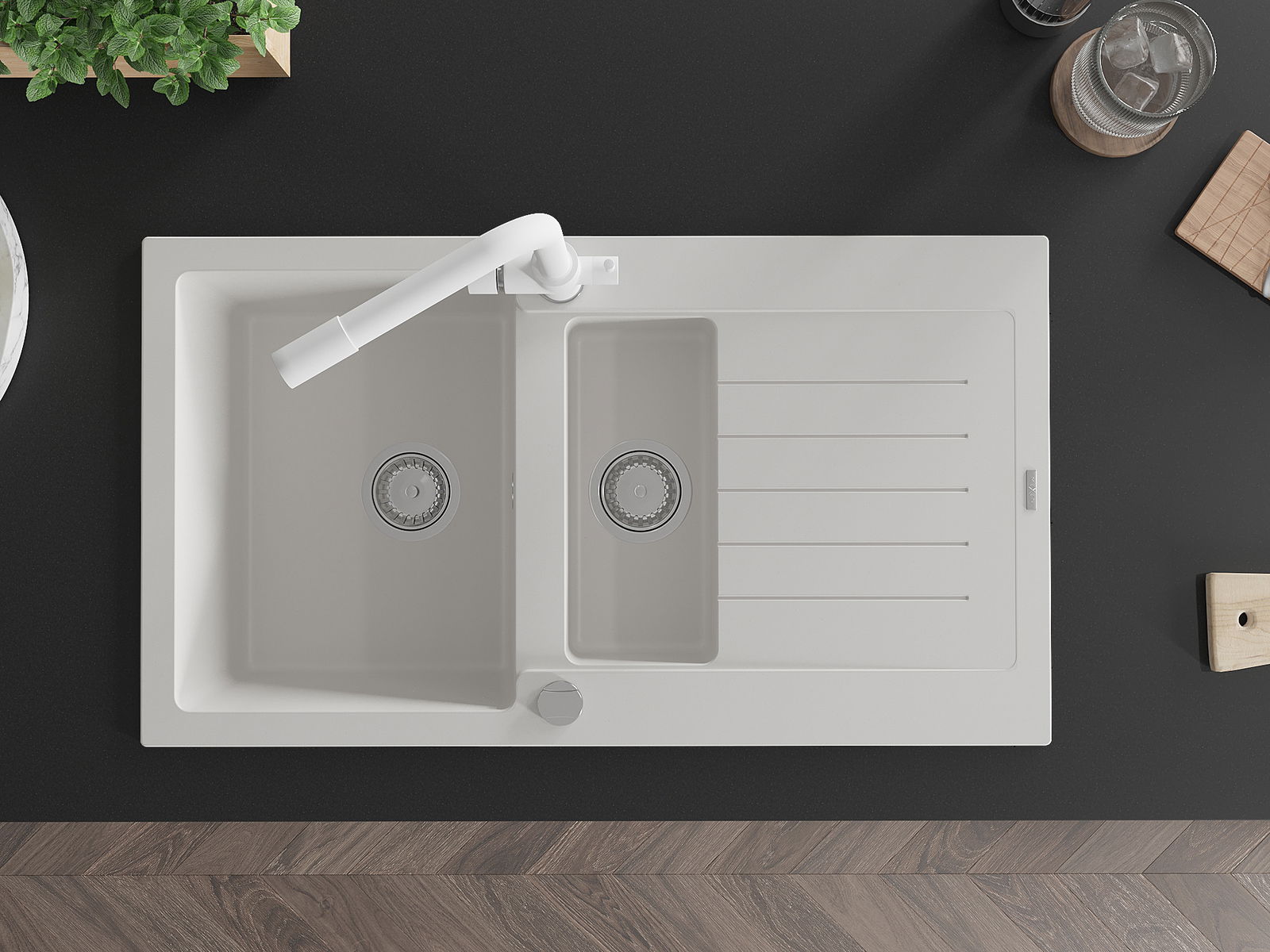 A mosogató felülete ellenáll a foltoknak és a elszíneződésnek, amelynek köszönhetően könnyű megtisztítani és hosszú ideig megtartja színét. Esztétikai és gyakorlatilag kiegészítve minden konyhát.