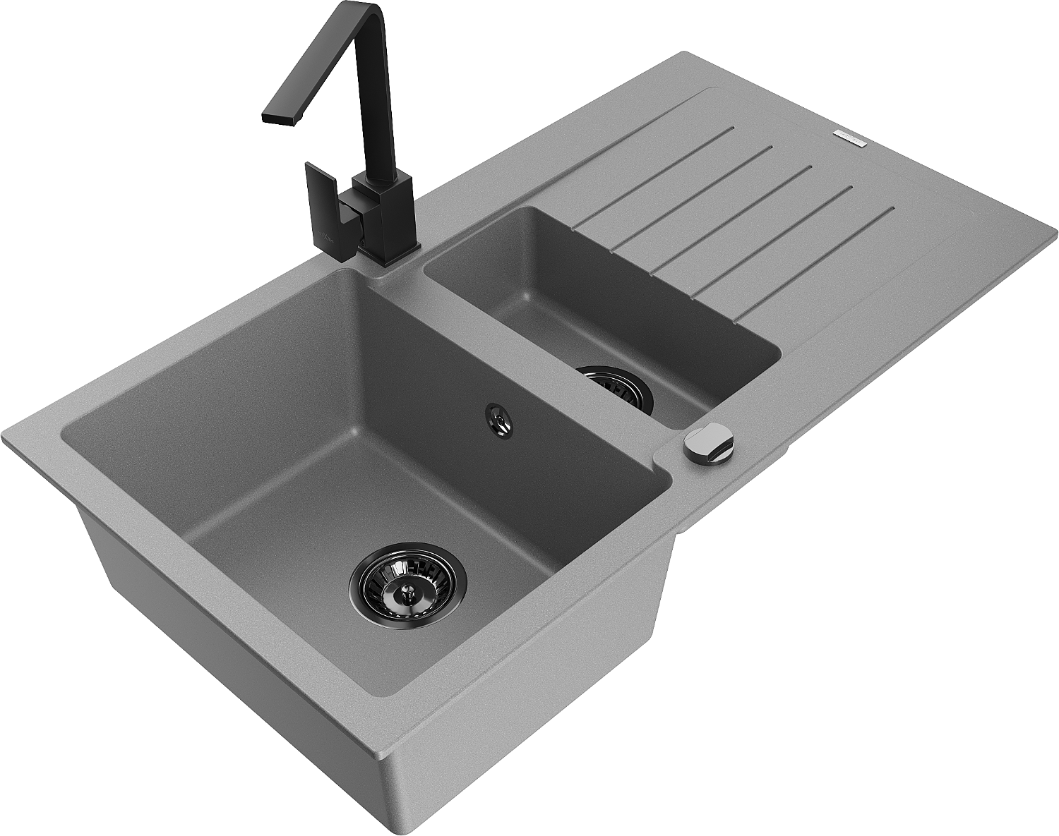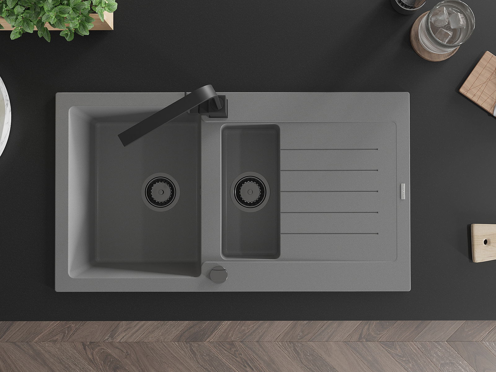 Mexen Matias gránit mosogató 1,5-medencés csepegtetővel és Rita konyhai csapteleppel, szürke - 6502-71-670300-70-B