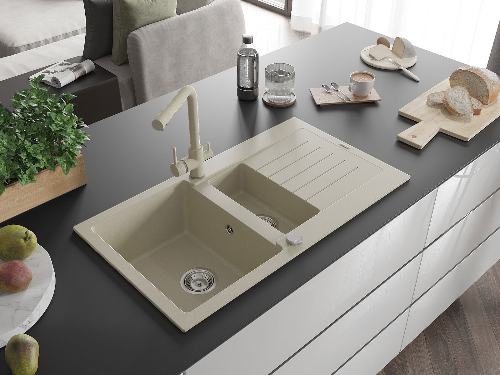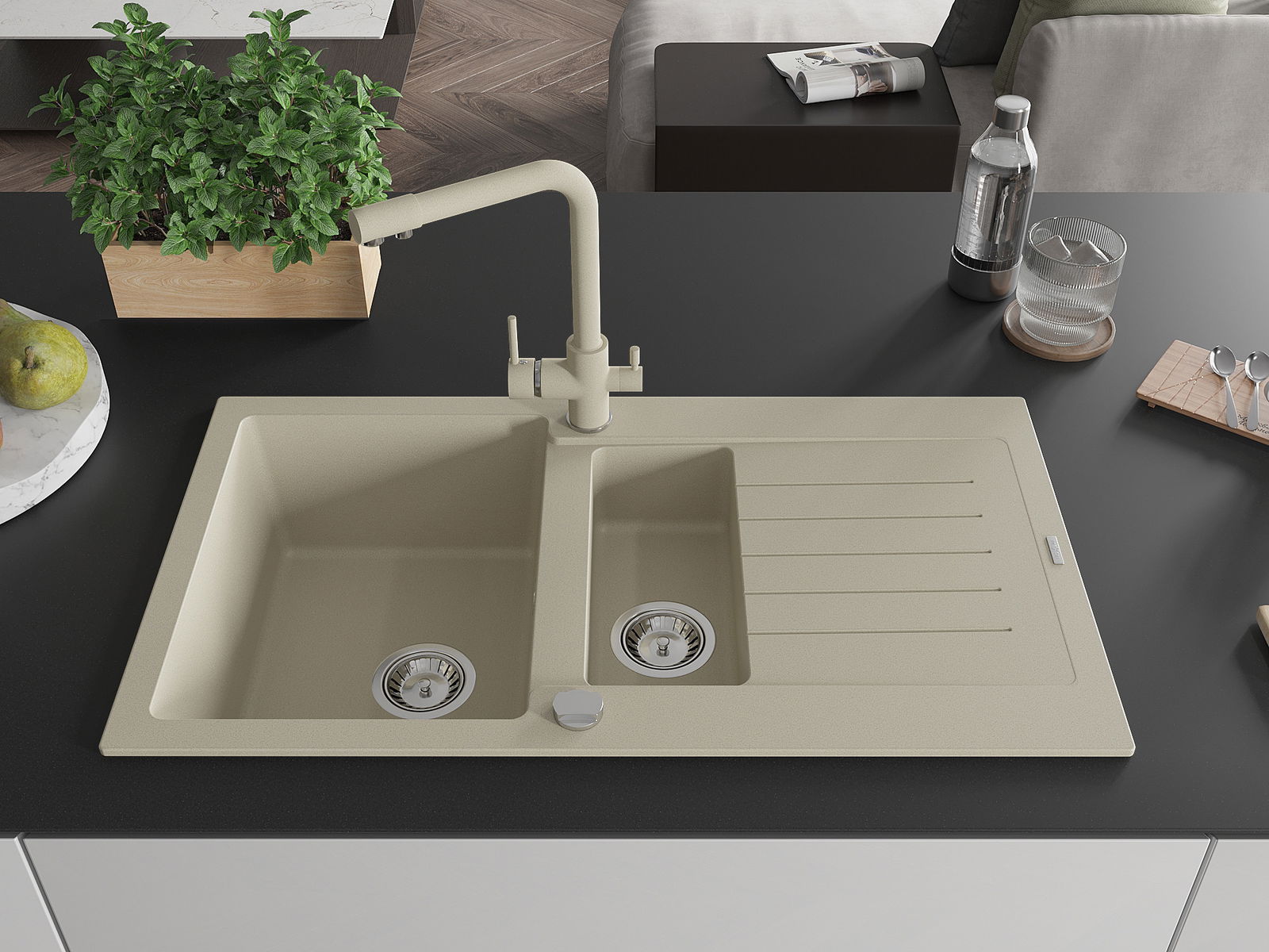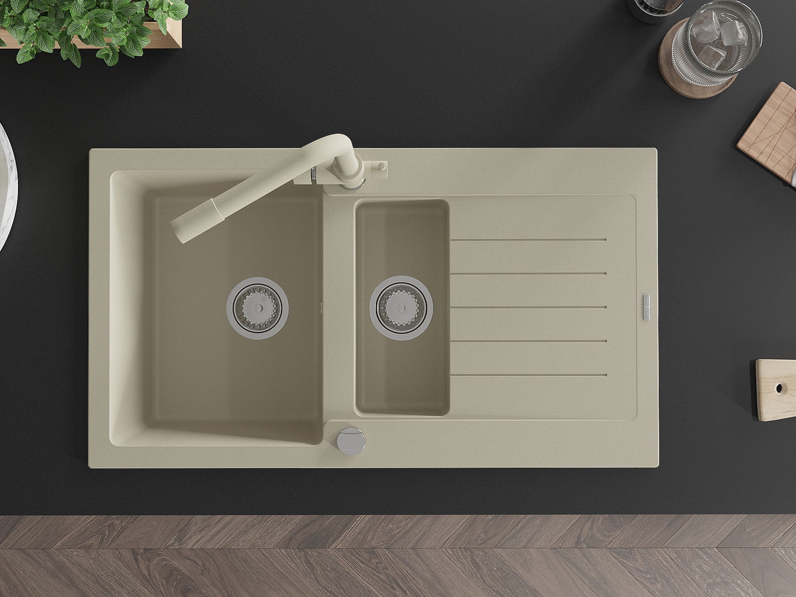 A mosogató felülete ellenáll a foltoknak és a elszíneződésnek, amelynek köszönhetően könnyű megtisztítani és hosszú ideig megtartja színét. Esztétikai és gyakorlatilag kiegészítve minden konyhát.
