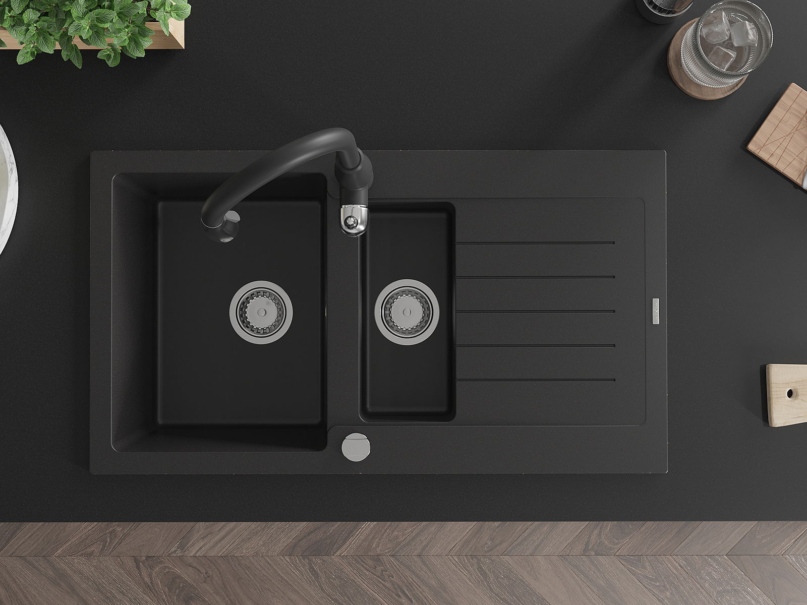 A mosogató kiváló minőségű gránitból készül. Ez egy elegáns és mindenekelőtt minden konyhához praktikus kiegészítés, stílusától függetlenül. A kiváló minőségű és a gránit tartósság biztosítja a sok éves használatát.