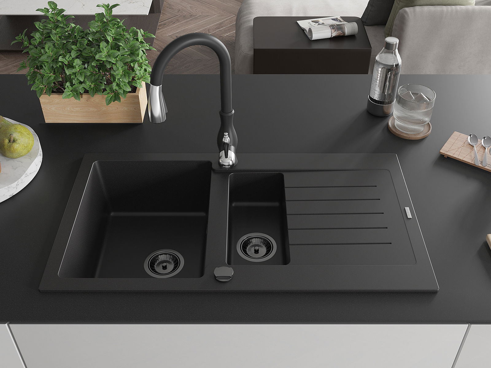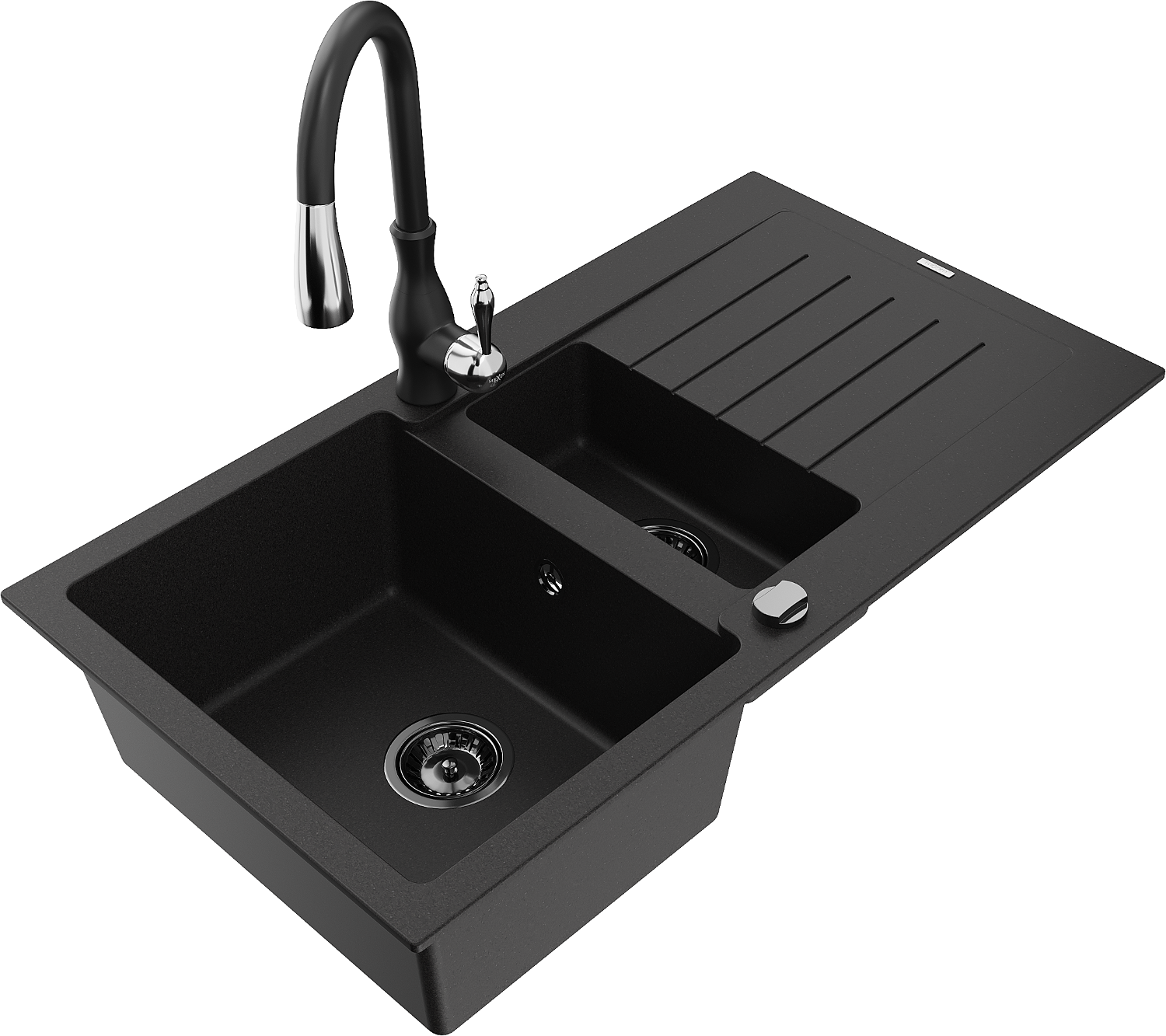 Mexen Matias 1,5-nyílású gránit mosogató csepegtetővel és Savita konyhai csappal, fekete - 6502-77-672601-70-B
