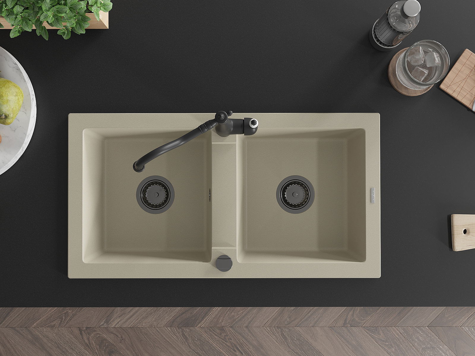 Mexen Mario 2 rekeszes gránit mosogató Carla konyhai csappal, bézs - 6504-69-670700-70