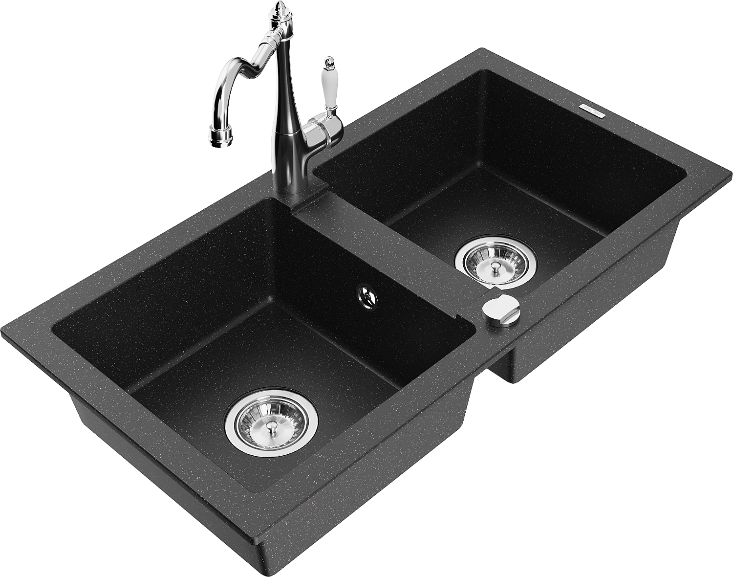 Mexen Mario kétkamrás gránit mosogató Carla konyhai csappal, fekete/ezüst metál - 6504-73-670700-00