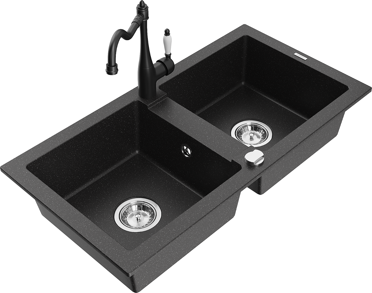 Mexen Mario 2-medencés gránit mosogató Carla konyhai csapteleppel, fekete/ezüst metál - 6504-73-670700-70
