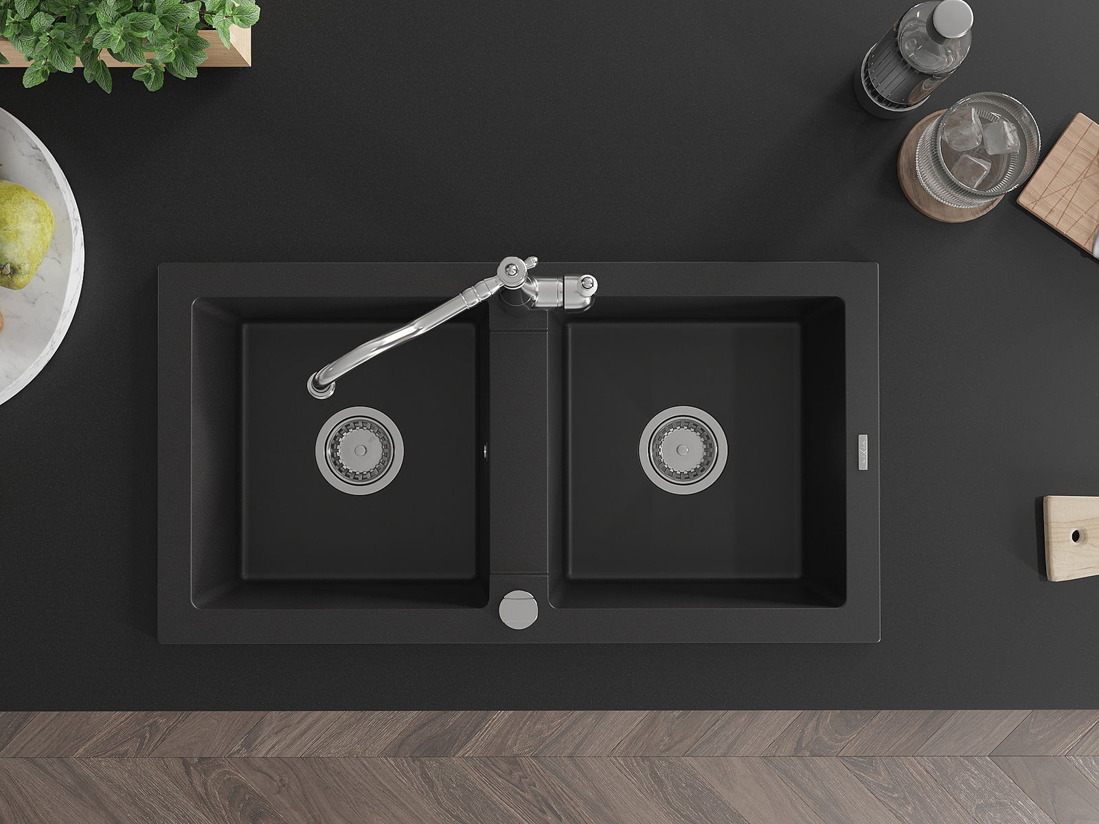 Mexen Mario 2 kamrás gránit mosogató Carla konyhai csapteleppel, fekete - 6504-77-670700-00