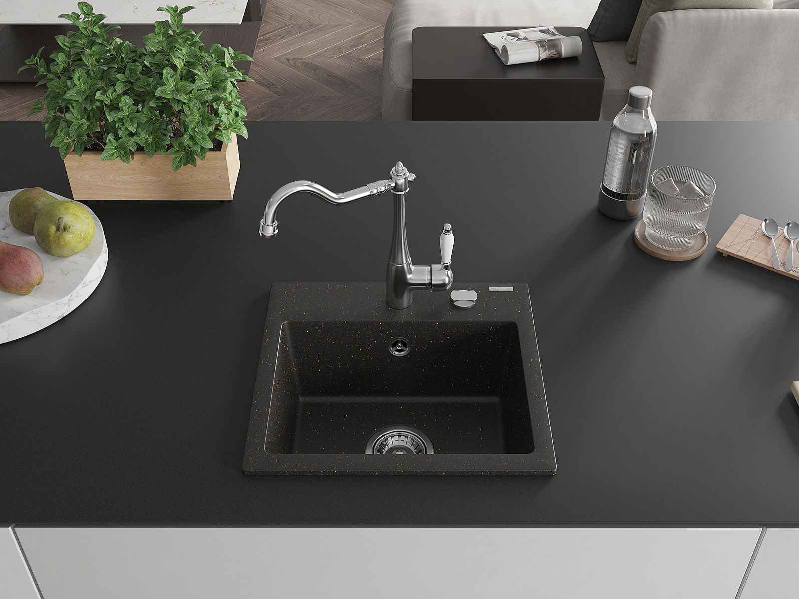 Mexen Milo 1 rekeszes gránit mosogató Carla konyhai csapteleppel, fekete/arany metál - 6505-75-670700-00