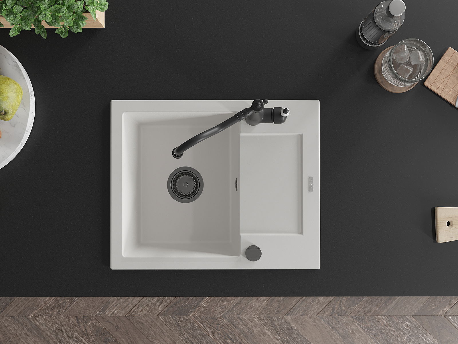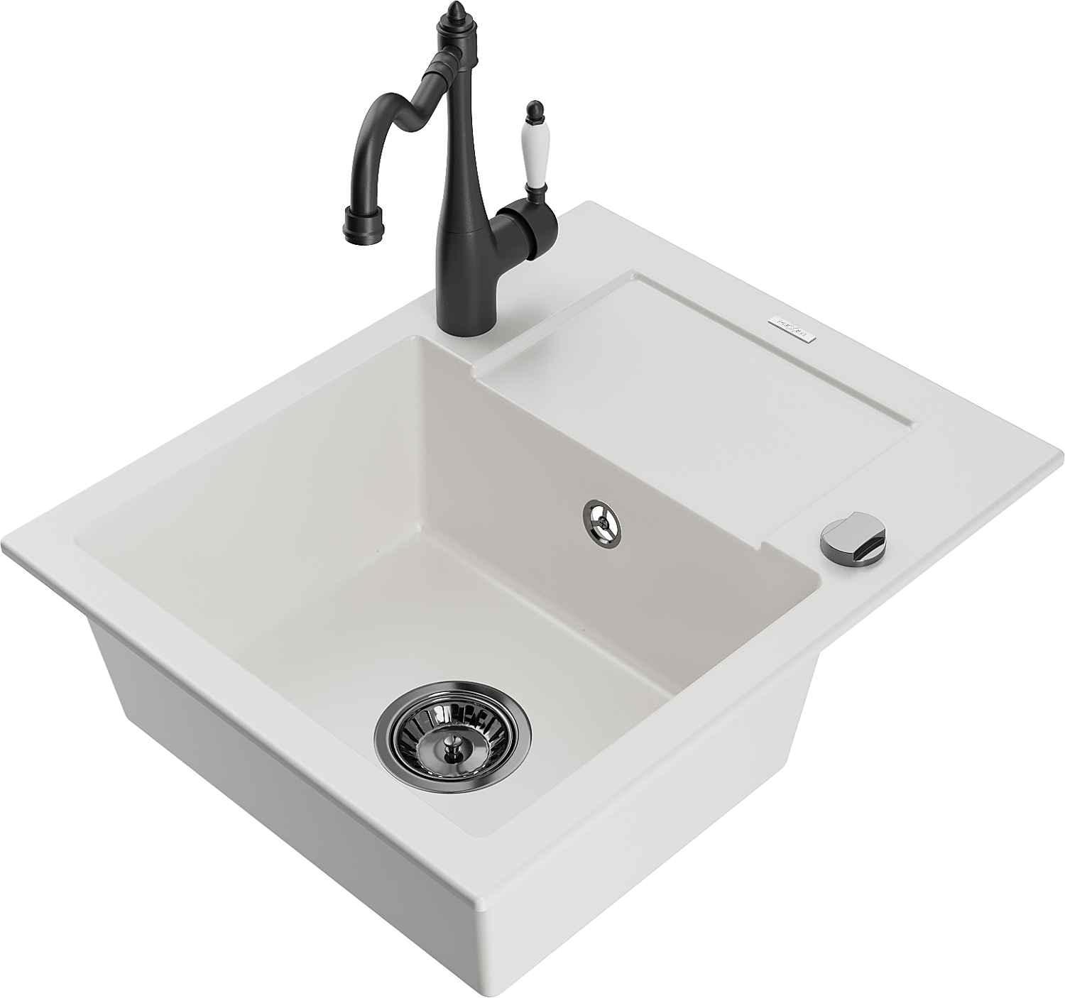 Mexen Enzo 1 rekeszes gránit mosogató lefolyóval és Carla konyhai csapteleppel, fehér - 6506-20-670700-70