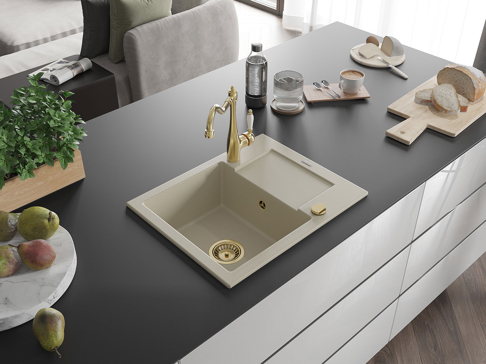 A mosogató kiváló minőségű gránitból készül. Ez egy elegáns és mindenekelőtt minden konyhához praktikus kiegészítés, stílusától függetlenül. A kiváló minőségű és a gránit tartósság biztosítja a sok éves használatát.