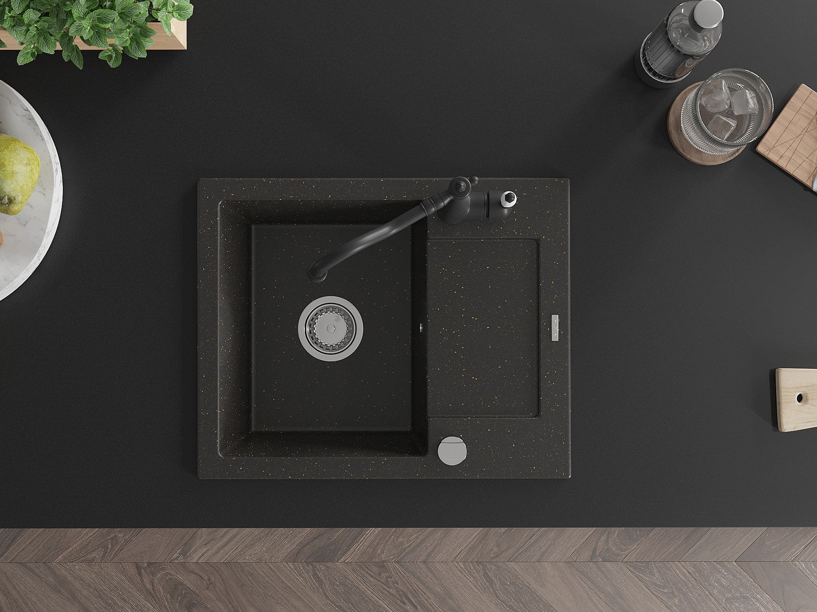Mexen Enzo gránit mosogató 1-medencés csepegtetővel és Carla konyhai csapteleppel, fekete/arany metál - 6506-75-670700-70