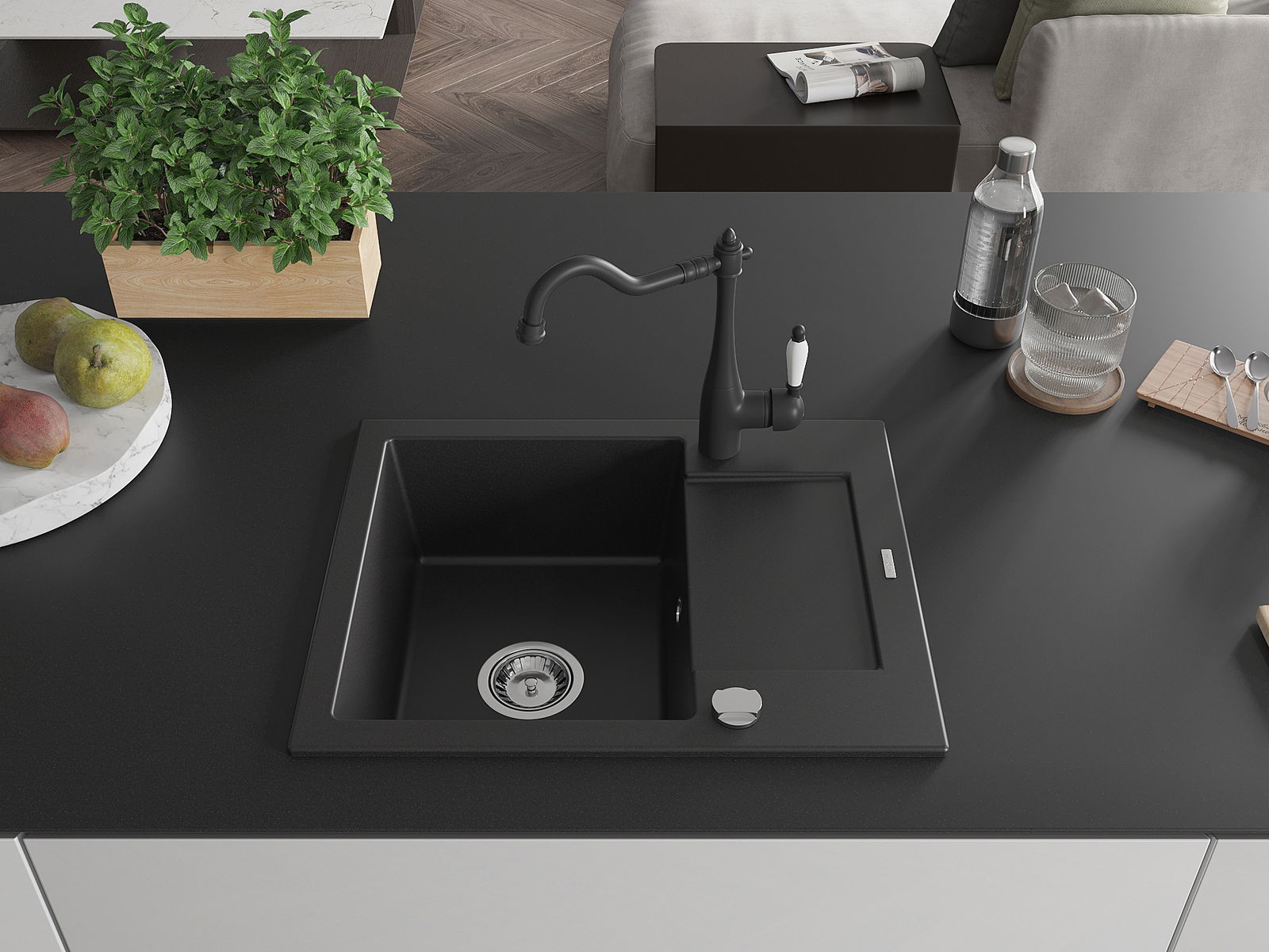 A mosogató magas minőségű gránitból készült. Elegáns, de mindenekelőtt praktikus kiegészítője minden konyhának, függetlenül annak stílusától. A gránit magas minősége és tartóssága hosszú távú használatot biztosít.