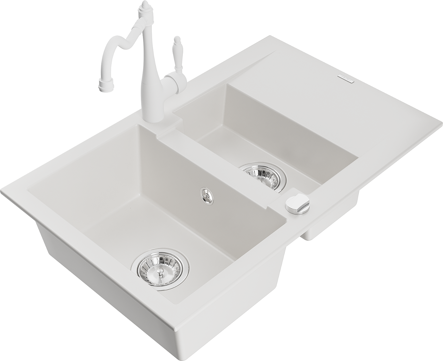 Mexen Gaspar 1,5 rekeszes gránit mosogató csepegtetővel és Carla fehér konyhai csappal - 6507-20-670700-20