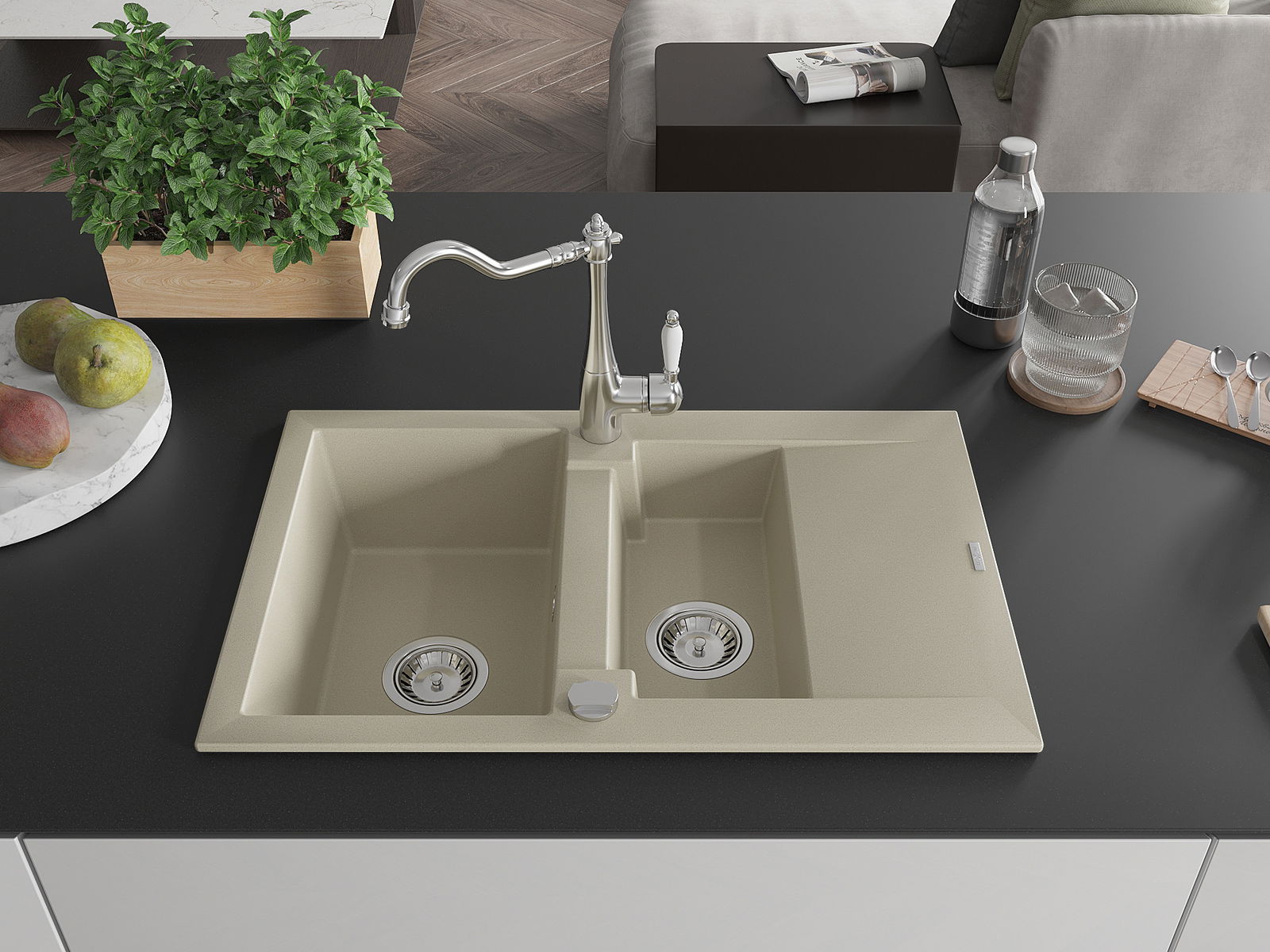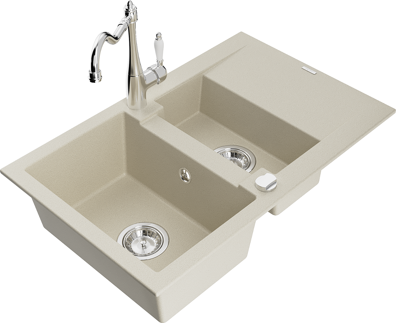 Mexen Gaspar gránit mosogatótálca 1,5 rekeszes csepegtetővel és Carla konyhai csapteleppel, bézs - 6507-69-670700-00