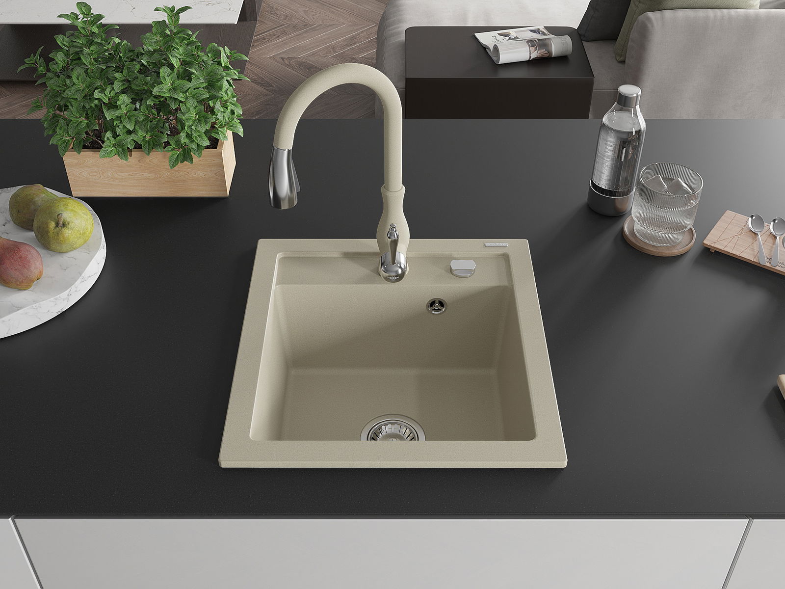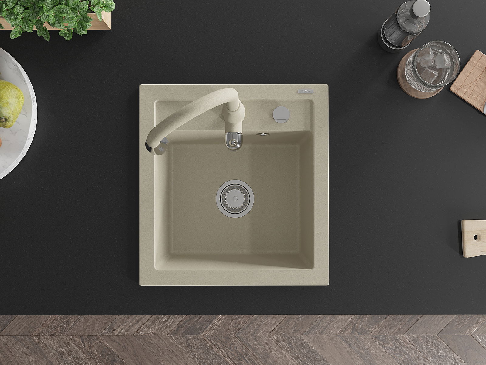 A mosogató kiváló minőségű gránitból készül. Ez egy elegáns és mindenekelőtt minden konyhához praktikus kiegészítés, stílusától függetlenül. A kiváló minőségű és a gránit tartósság biztosítja a sok éves használatát.