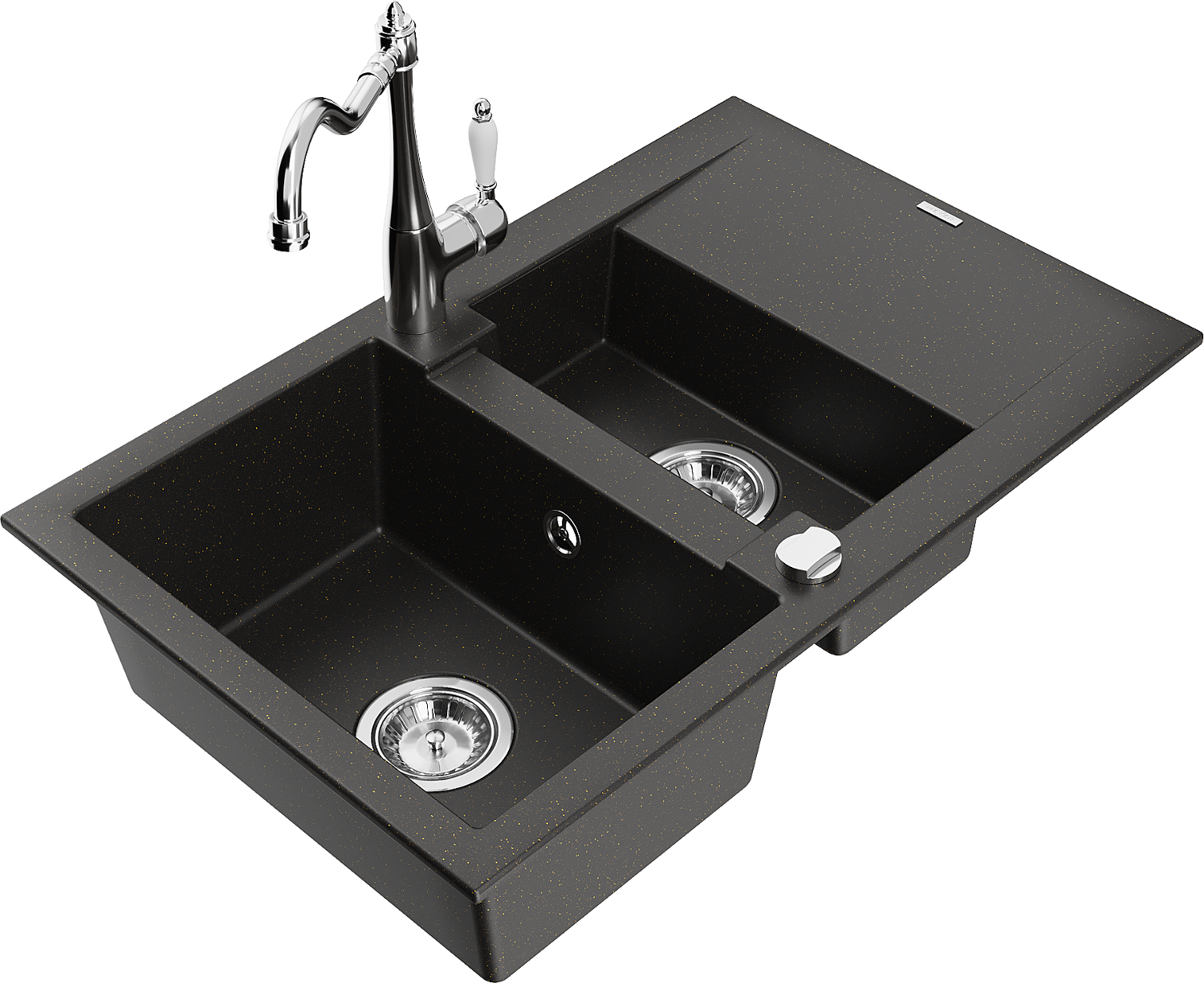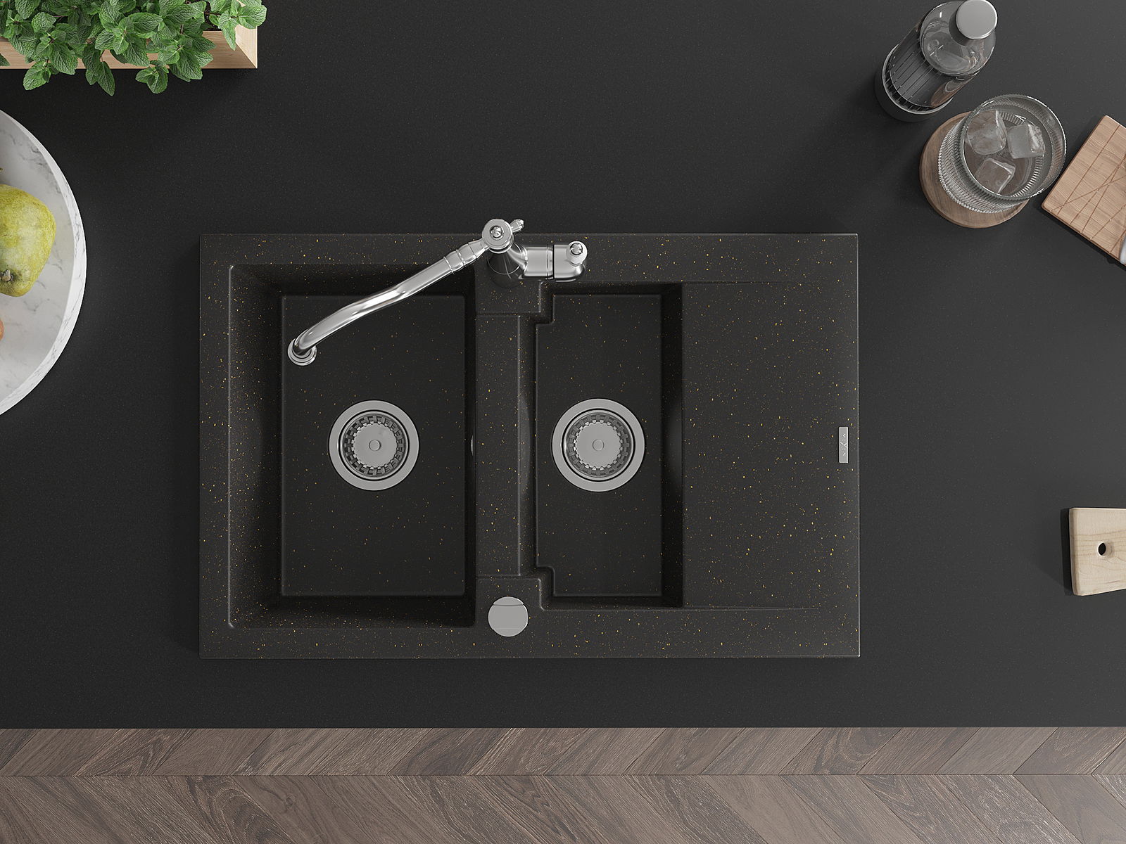 Mexen Gaspar 1,5-medencés gránit mosogató csepegtetővel és Carla konyhai csapteleppel, fekete/arany metál - 6507-75-670700-00
