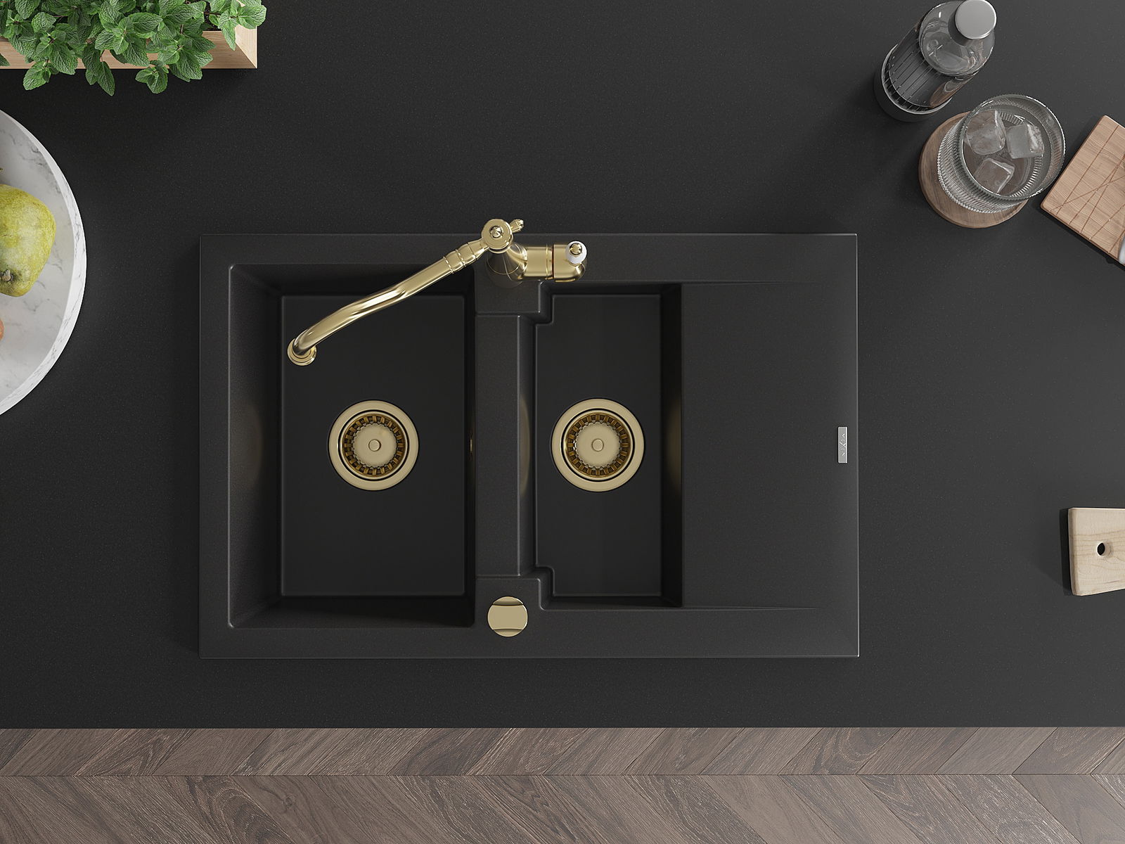 Mexen Gaspar gránit mosogató 1,5 medencés csepegtetővel és Carla konyhai csappal, fekete - 6507-77-670700-50