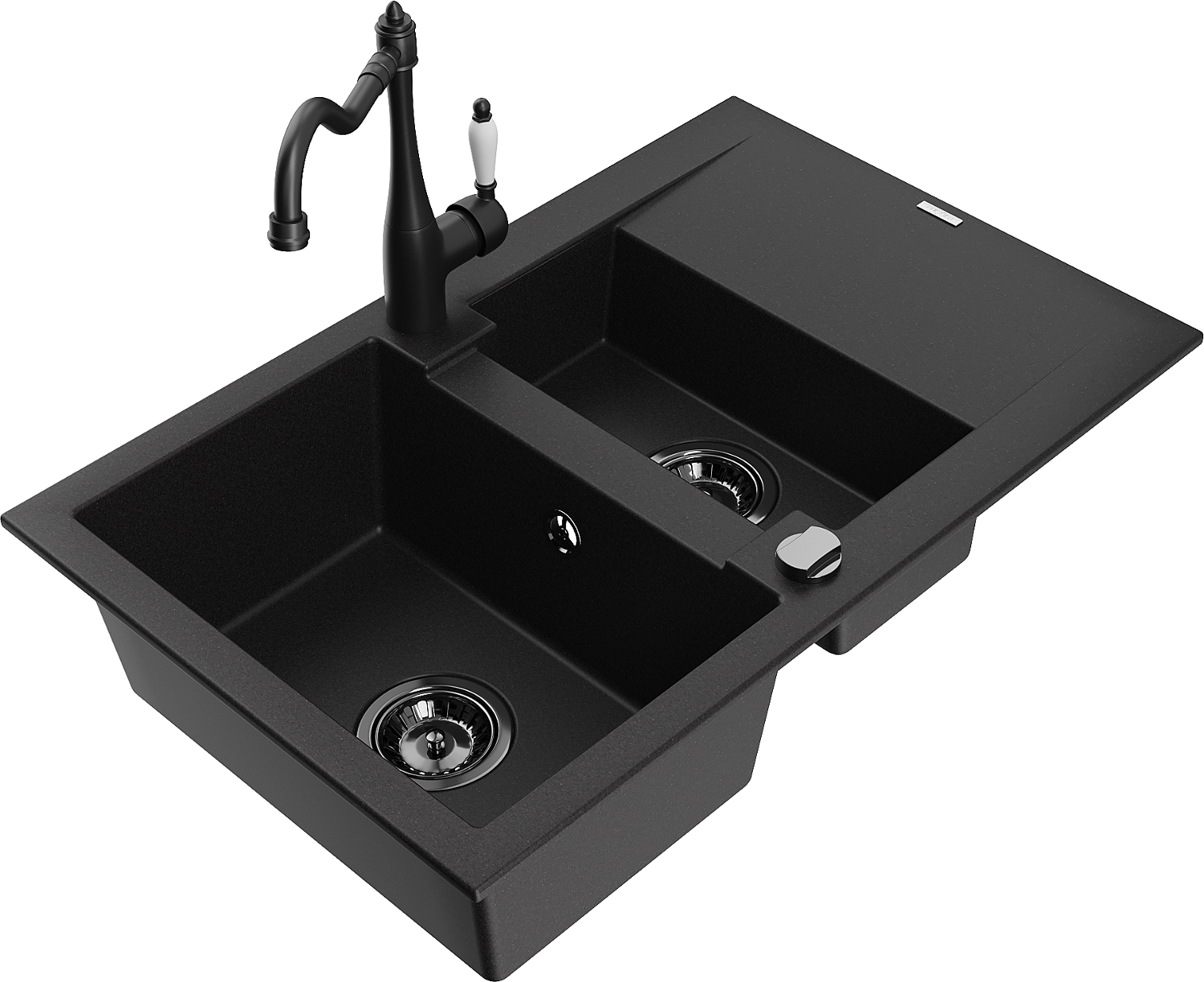 Mexen Gaspar 1,5-medencés gránit mosogató lefolyóval és Carla konyhai csappal, fekete - 6507-77-670700-70-B
