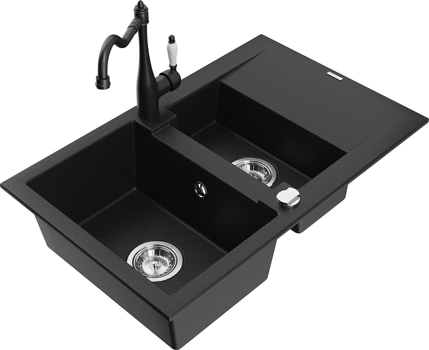 Mexen Gaspar gránit mosogató 1,5 rekeszes csepegtetővel és Carla konyhai csapteleppel, fekete - 6507-77-670700-70